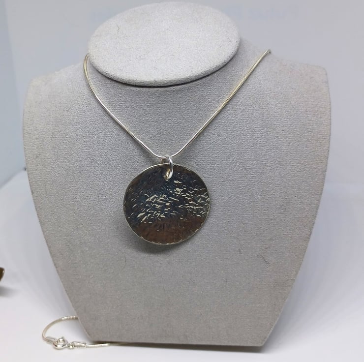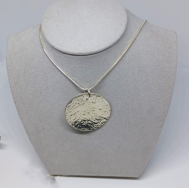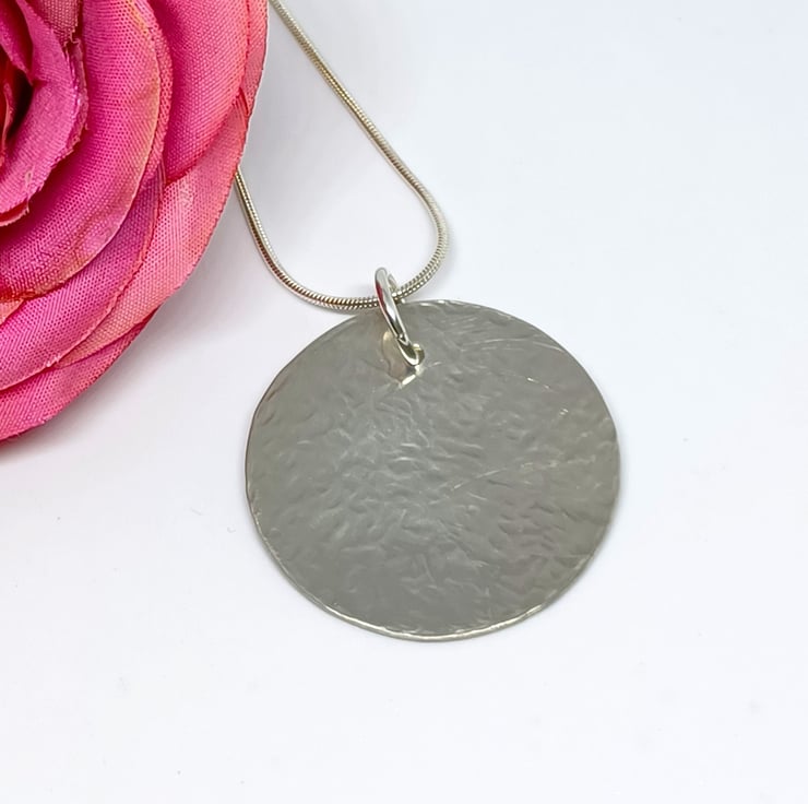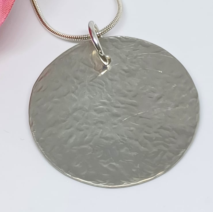 This pretty pendant features a hammered textured disc, that measures approximately 30mm.