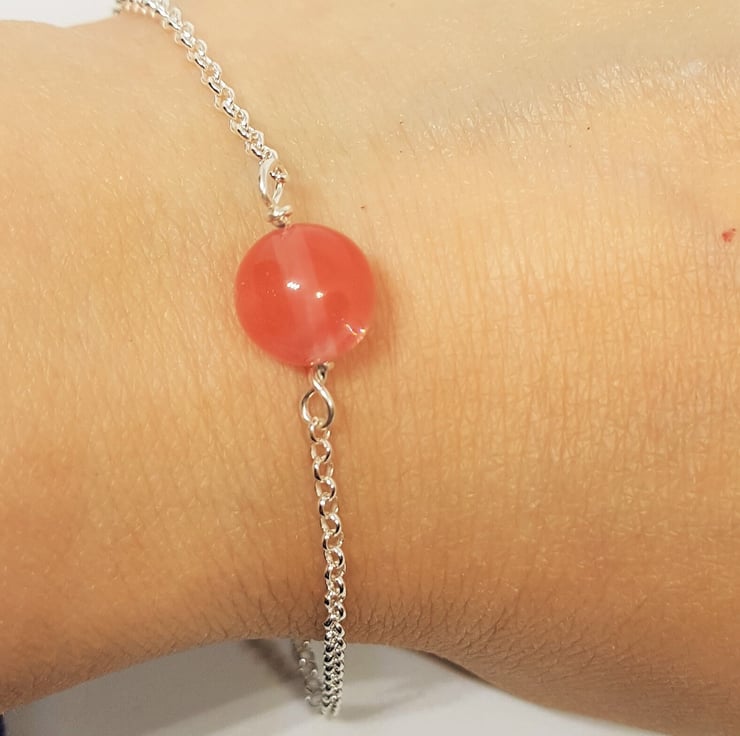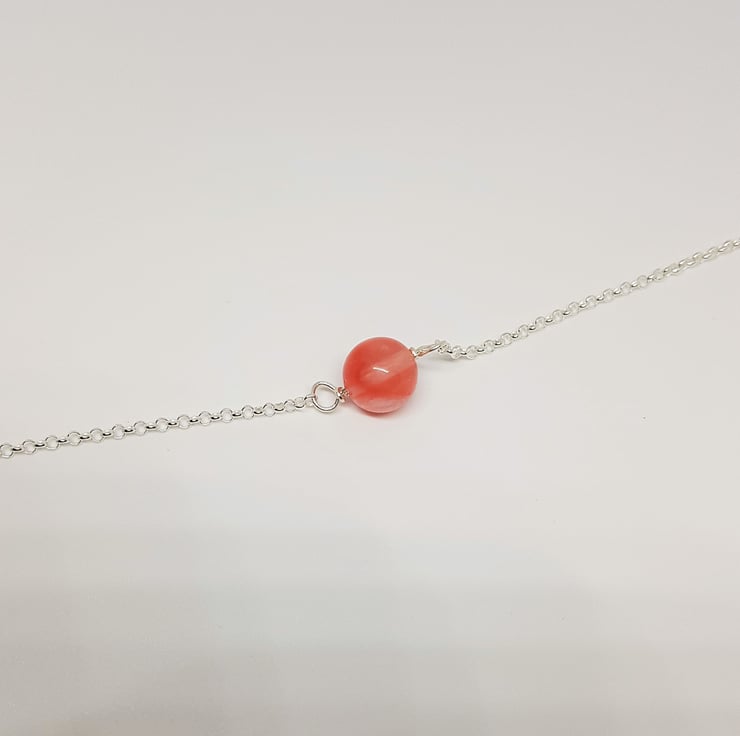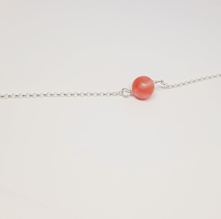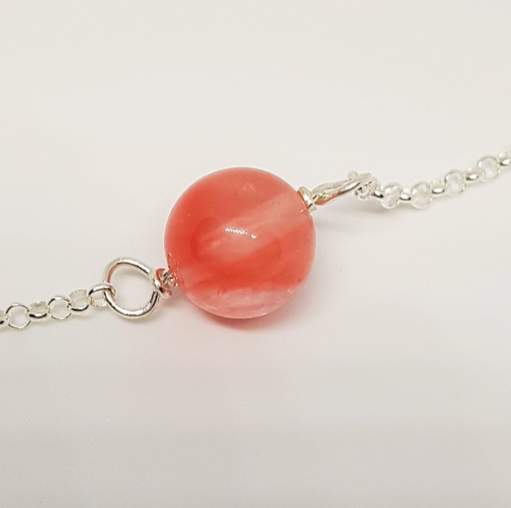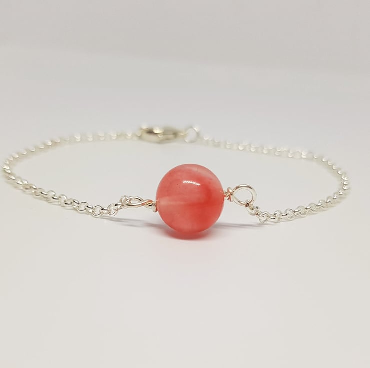 This bracelet features a gorgeous 10mm bead of Strawberry Quartz, set on a sterling silver chain to form the bracelet. It fastens with a lobster claw clasp.