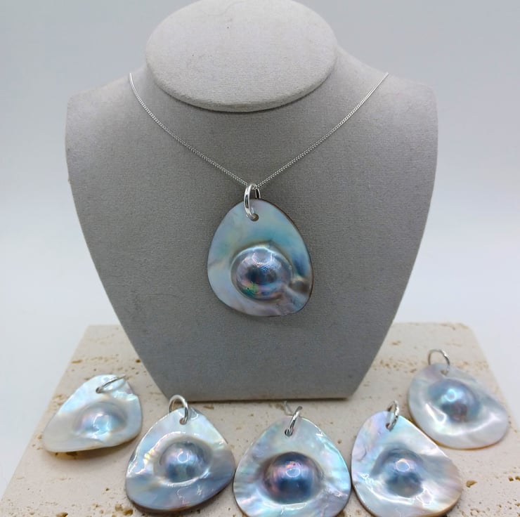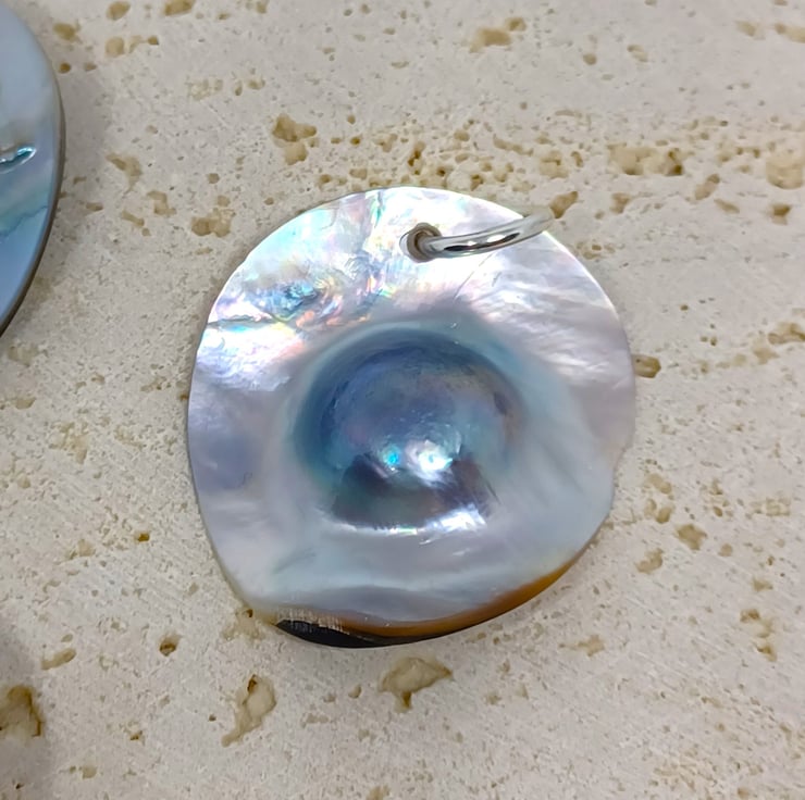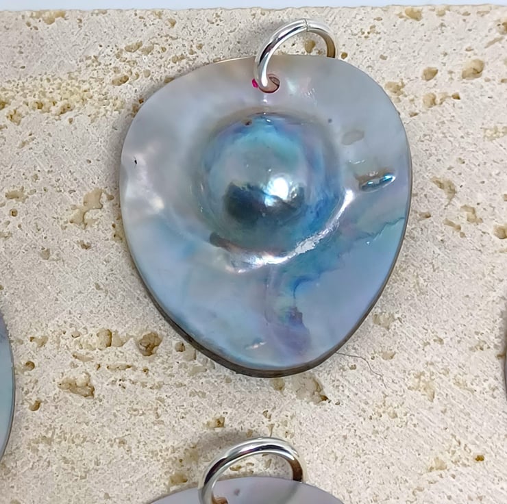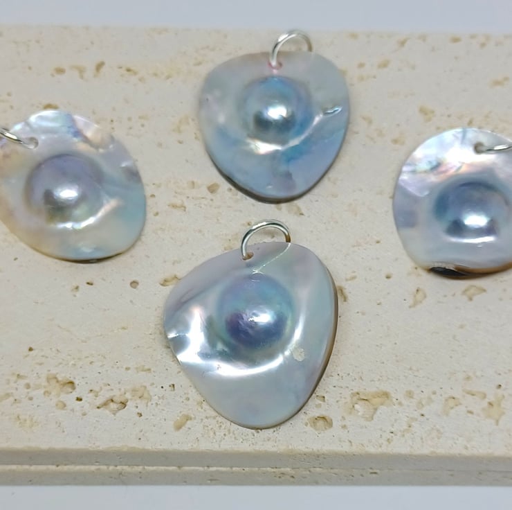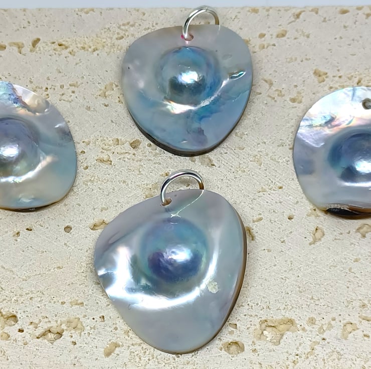 These are Mabe pearls (pronounced Mah-Bay) they are basically cultured blister pearls that have grown attached to the shell of the mollusk. They make amazing statement pendants when added to the thicker sterling silver findings. I only have four available I may not be able to get any more of these! You will be supplied one at random from the selection available. They measure approximately 4cm.