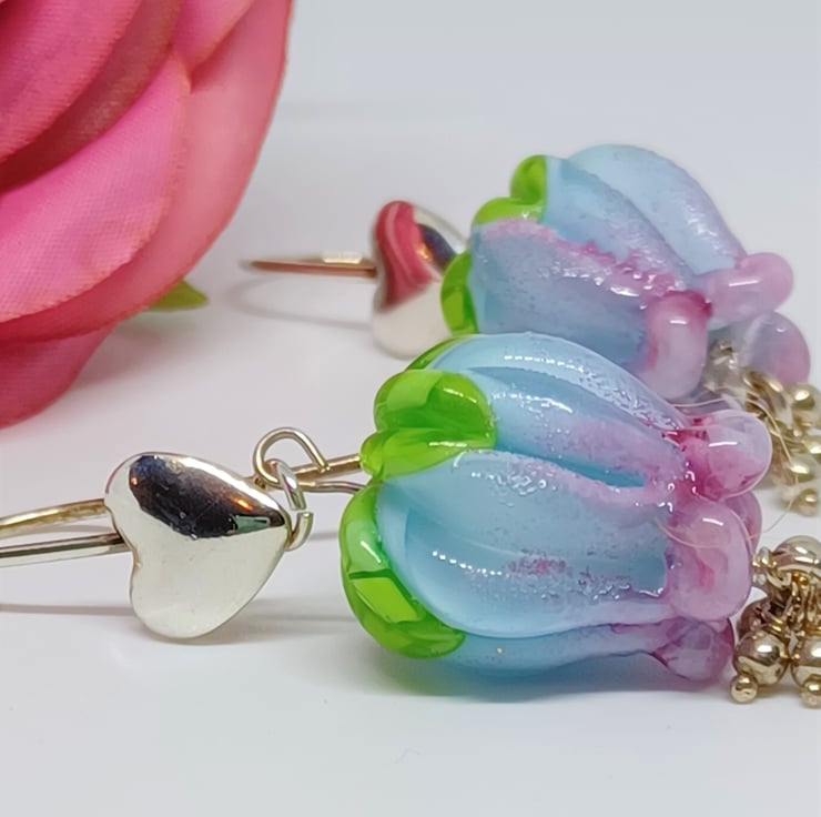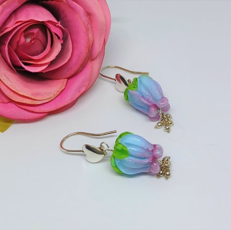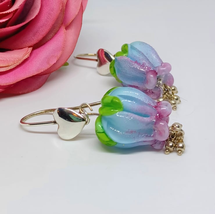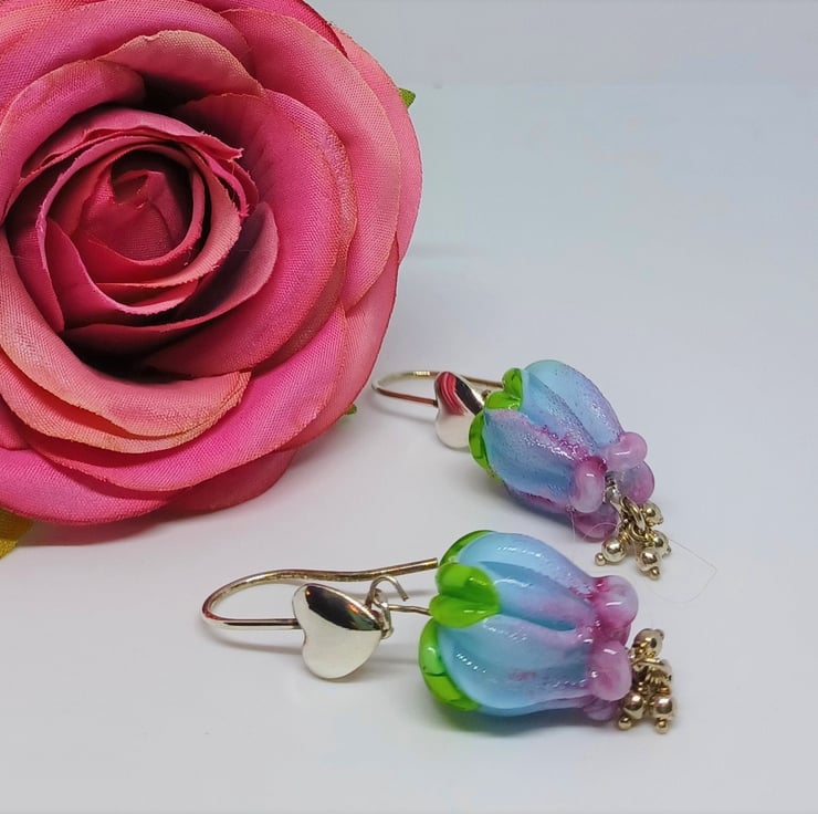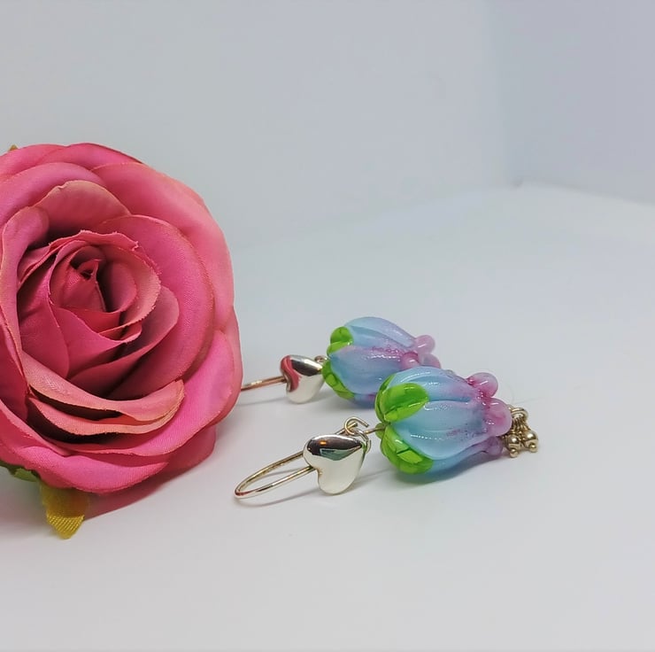 The lampwork rosebud is a beautiful shade of blue, with pinkypurple tip. They feature tiny sterling silver ball dangles, and the silver earwires have hearts just above the rosebud..