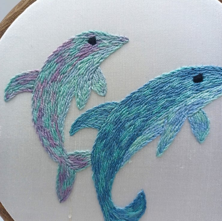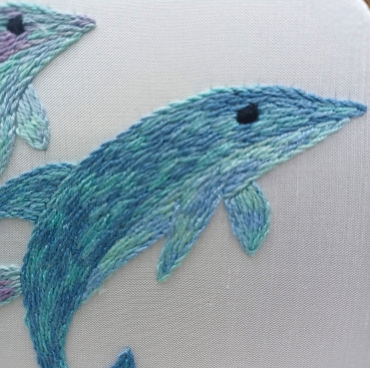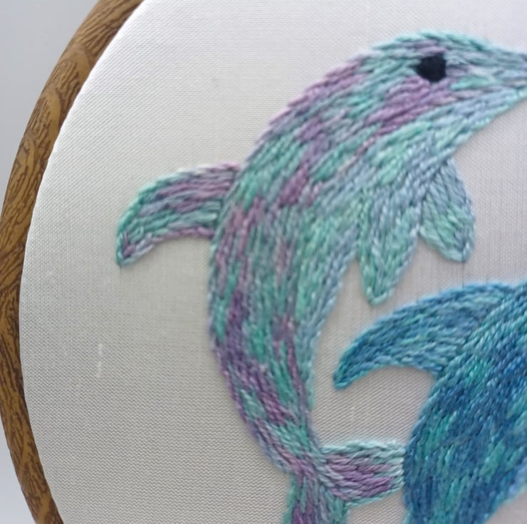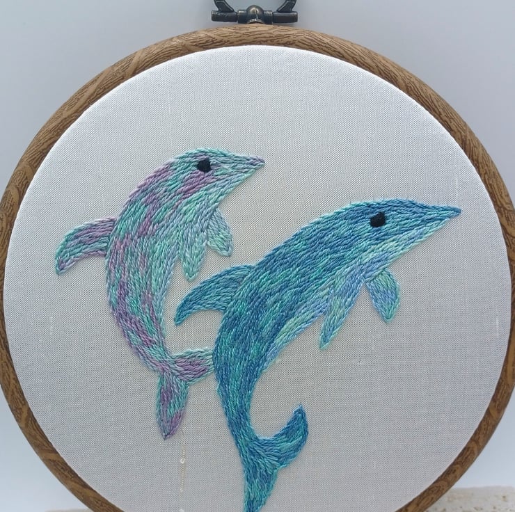 This dolphin design is hand stitched using variegated silk threads, on to a gorgeous white silk backing, and is framed in a 6 inch hoop. The hoop is backed with felt to protect the embroidery, and your wall!