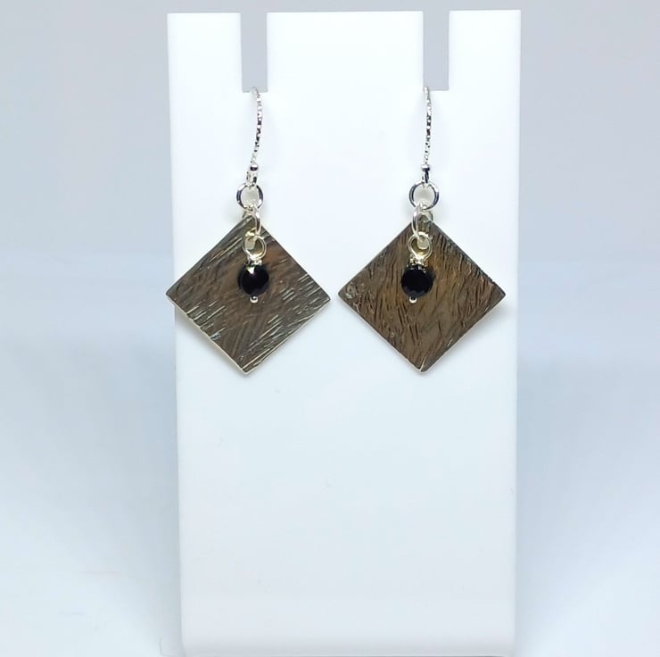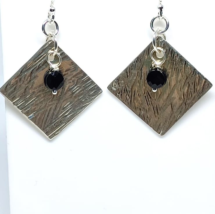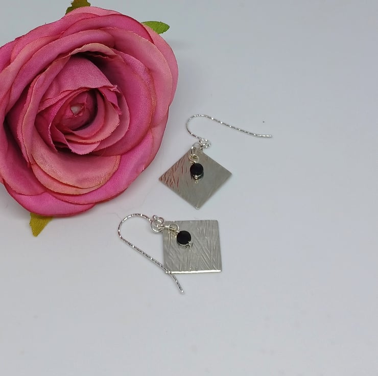 These lovely sterling silver diamonds have had a beautiful texture added, using traditional silversmithing techniques, they have a black spinel coin shaped dangle, and are finished with sparkly sterling silver earwires.