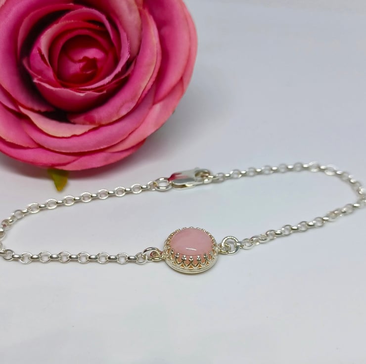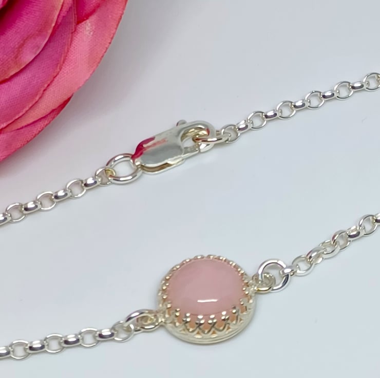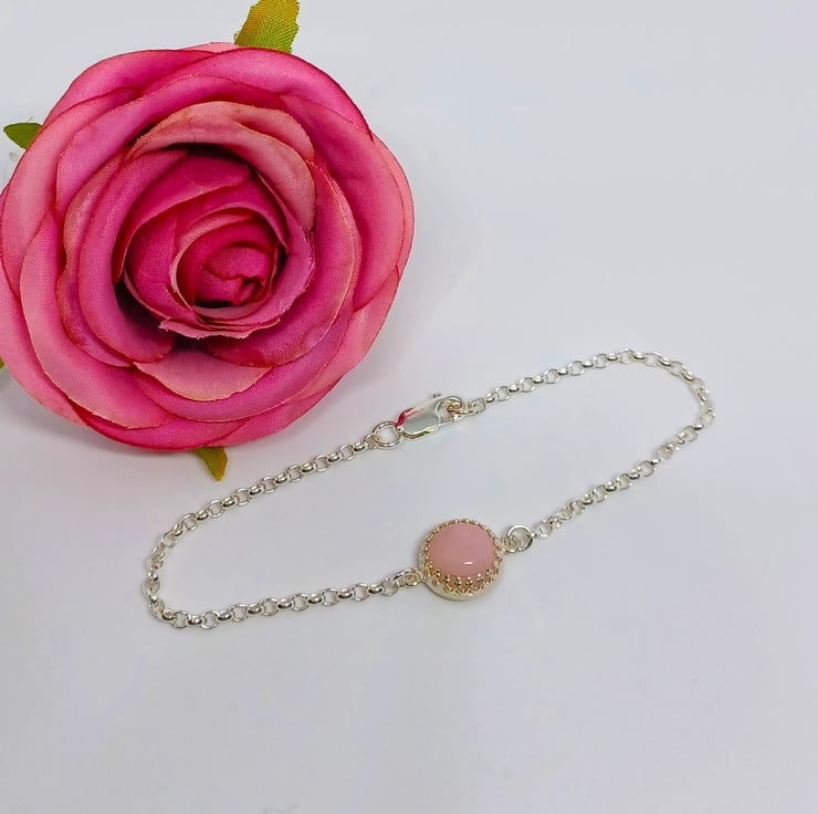 A gorgeous pink opal cabochon bracelet. The pink opal is set into a fancy surround, then finished with sterling silver chain.. All findings are sterling silver. This style stackingbar bracelet looks lovely on its own, but equally lovely stacked.