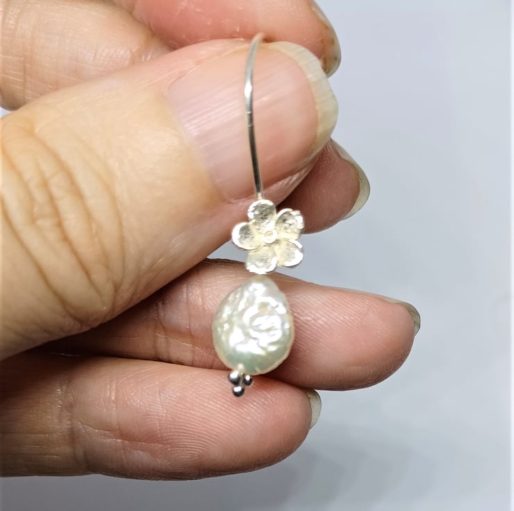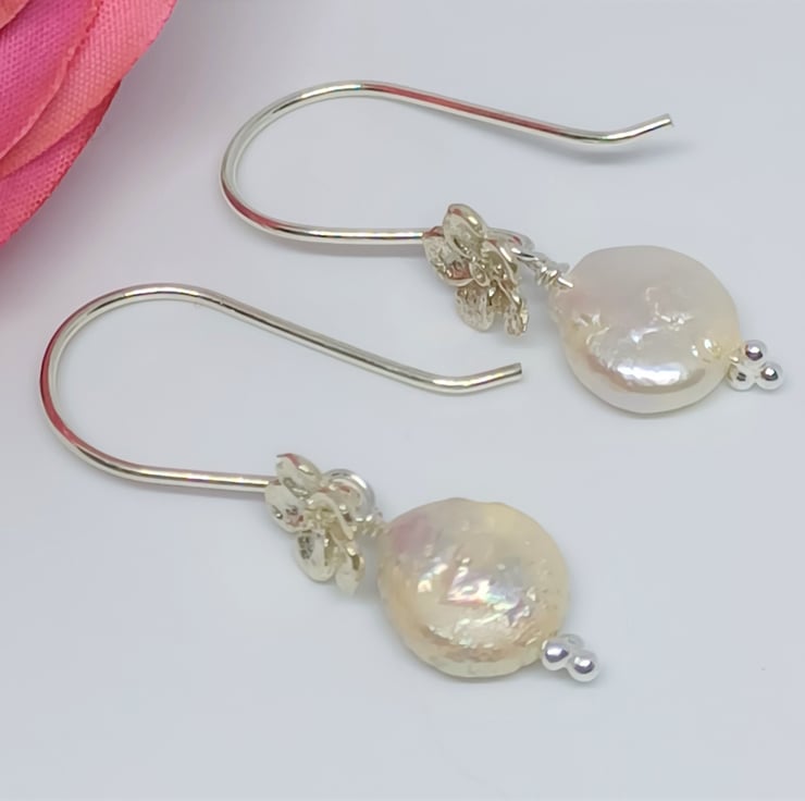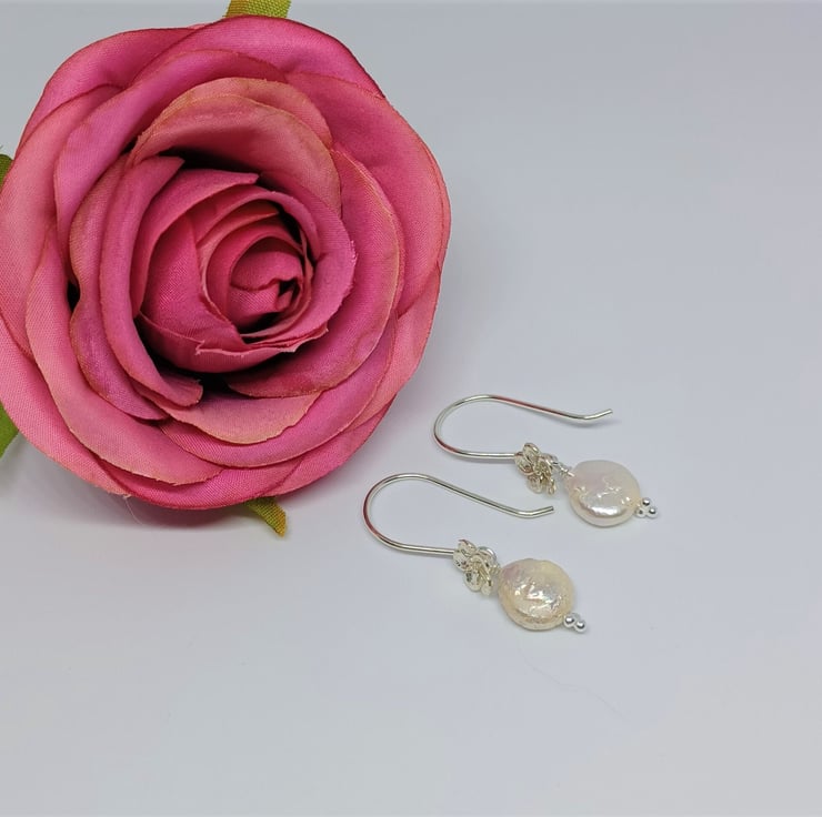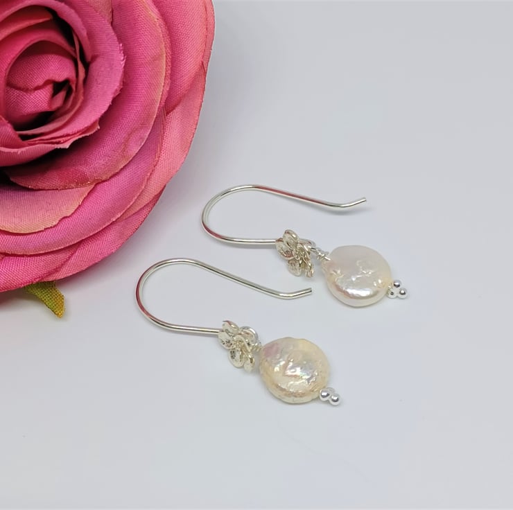 This pair of small white coin shaped pearls are set on sterling silver earwires, with tiny silver flowers for that little extra detail. Please see photos for indication of size.