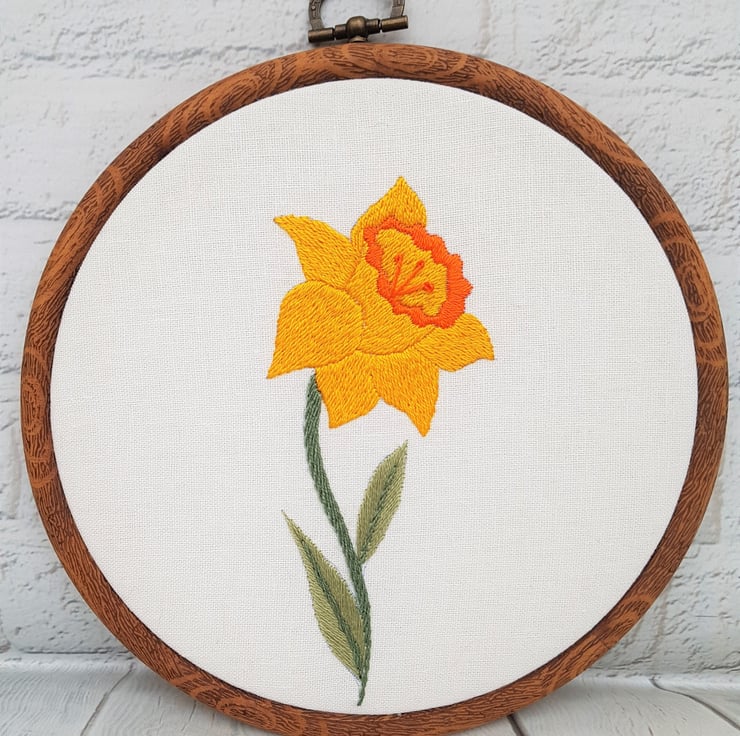 This Daffodil embroidery has been completely hand stitched using silk threads, on to a linen backing. Framed in a six inch hoop with integral hanger.