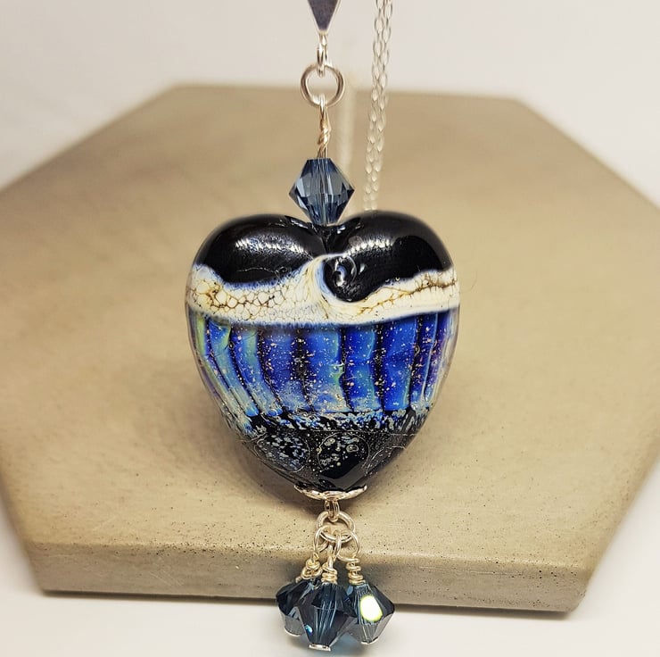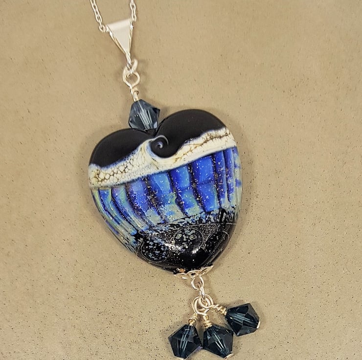 Blue Lampwork Glass Galaxy Heart This beautiful necklace has been made from my stash of lampwork glass hearts. It has the most amazing galaxy like effect. It has been combined with sterling silver findings, and finished with Swarovski crystals for a little bit of sparkle!