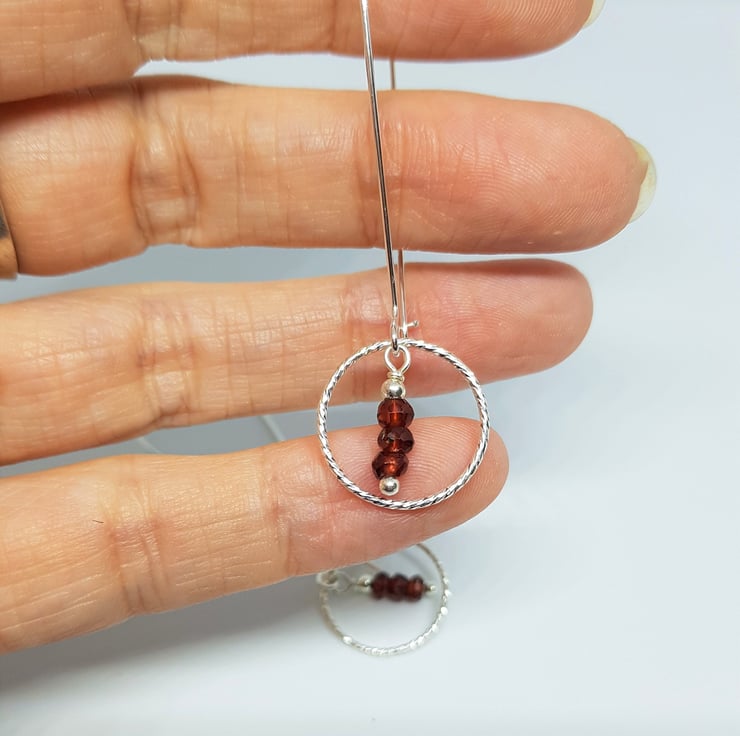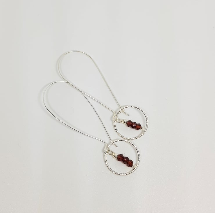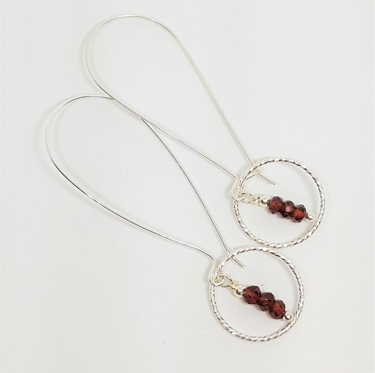 A trio of garnet rondelle beads are suspended in the centre of a sparkly twisted hoop, and they are finished with these fabulous long ear wires