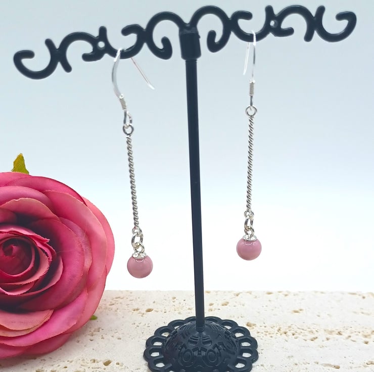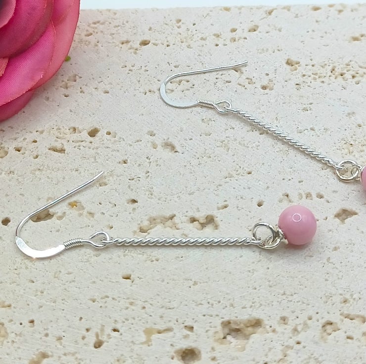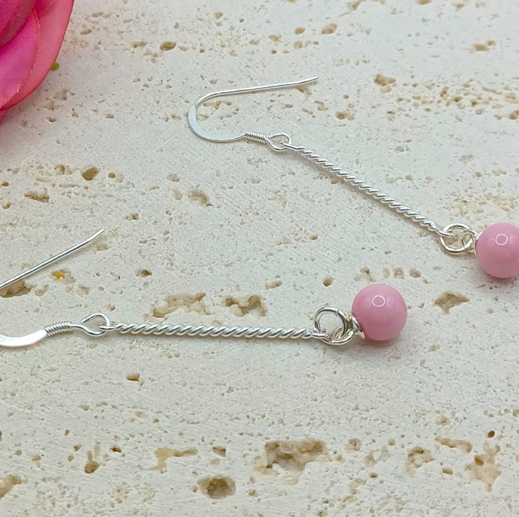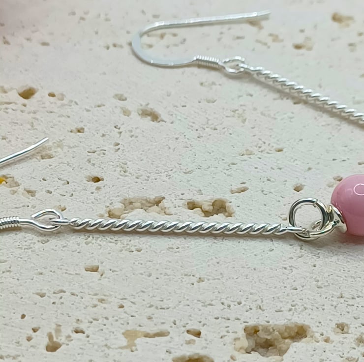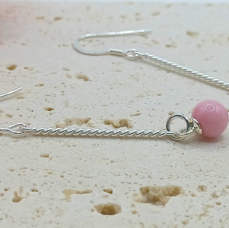 Pink lampwork glass ballsspheres are suspended below sterling silver twisted bar drops, then finished with sterling silver earwires. To give an indication of size, the glass spheres measure 7mm.