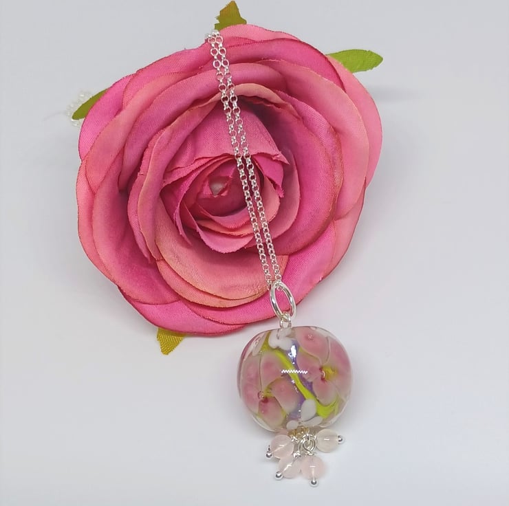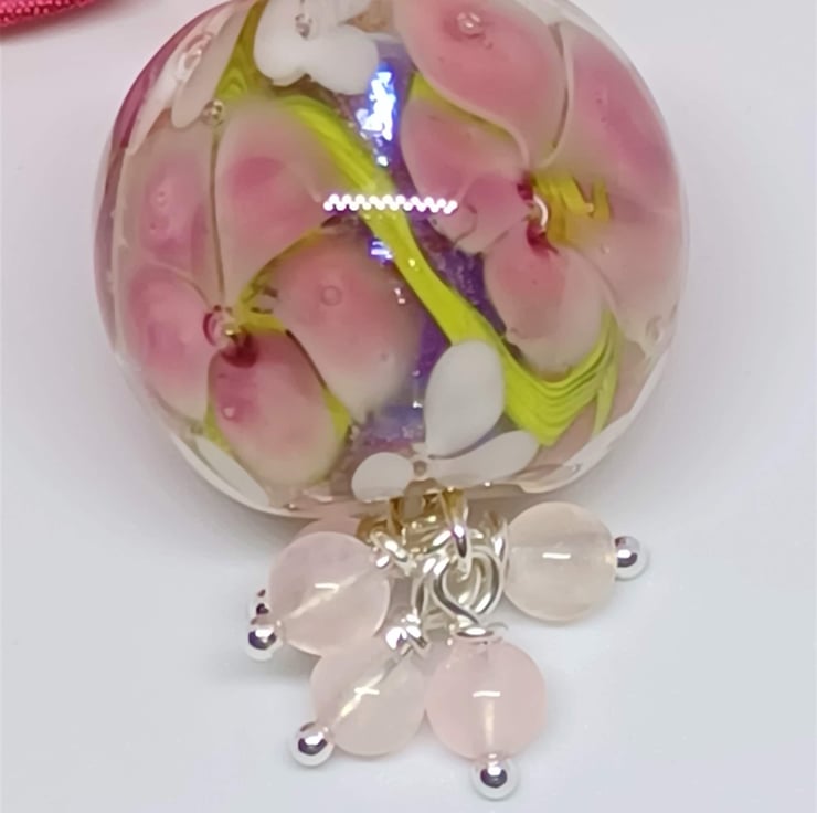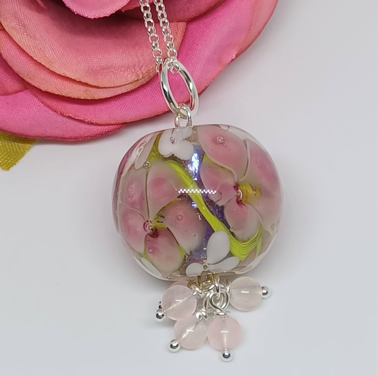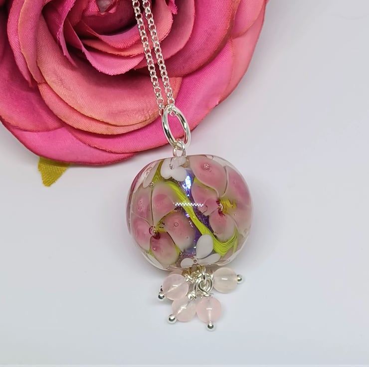 Pink Flower Lampwork Glass Pendant with Rose Quartz Drops