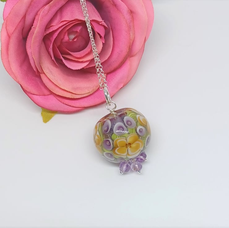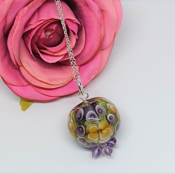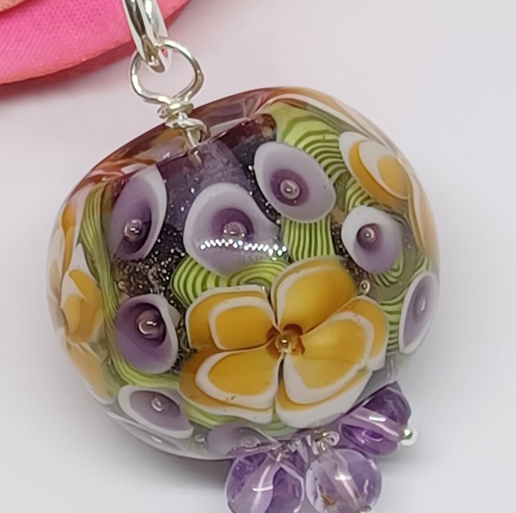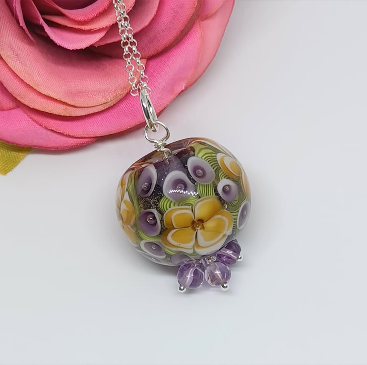 Purple and Orange Flower Lampwork Glass Pendant with Amethyst Drops