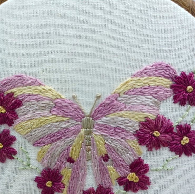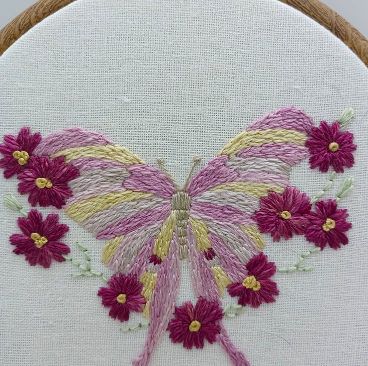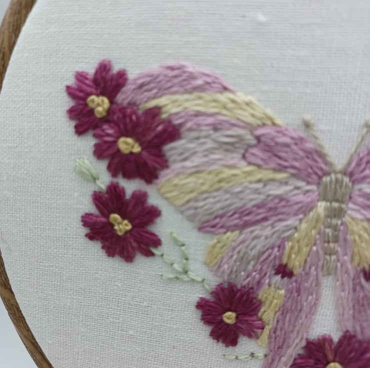 Hand embroidered onto linen, using beautiful shades of purple, pink, reds and yellow silk threads.