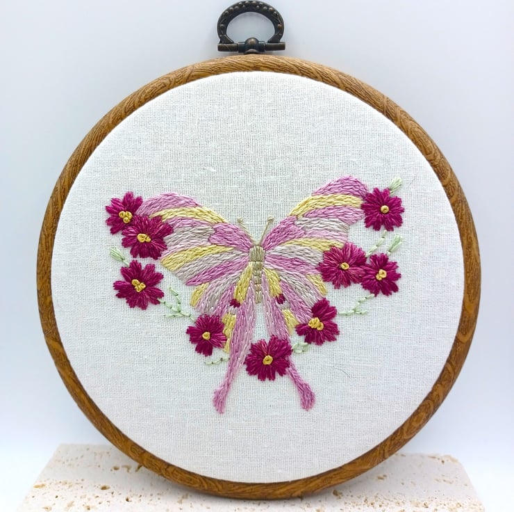 The moth is framed in a 5 inch hoop with integral hanger, which is finished with felt at the back to protect the stitching, and your wall!