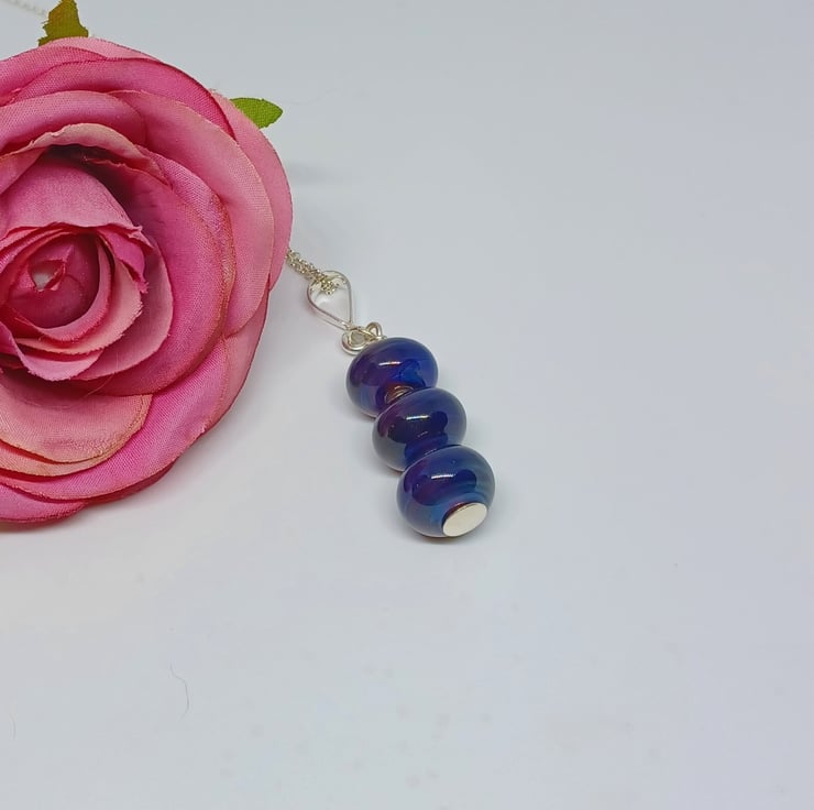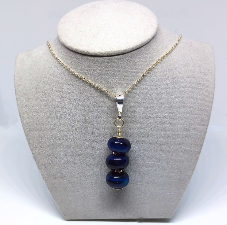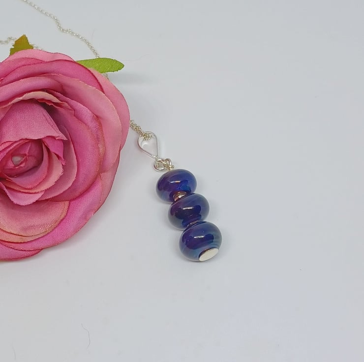 These gorgeous dark blue lampwork glass beads have an iridescent coating, so they look different colours as they move. The pendant has three lampwork glass beads, and are finished with elements of sterling silver. Supplied on an 18 inch sterling silver chain (style may vary)