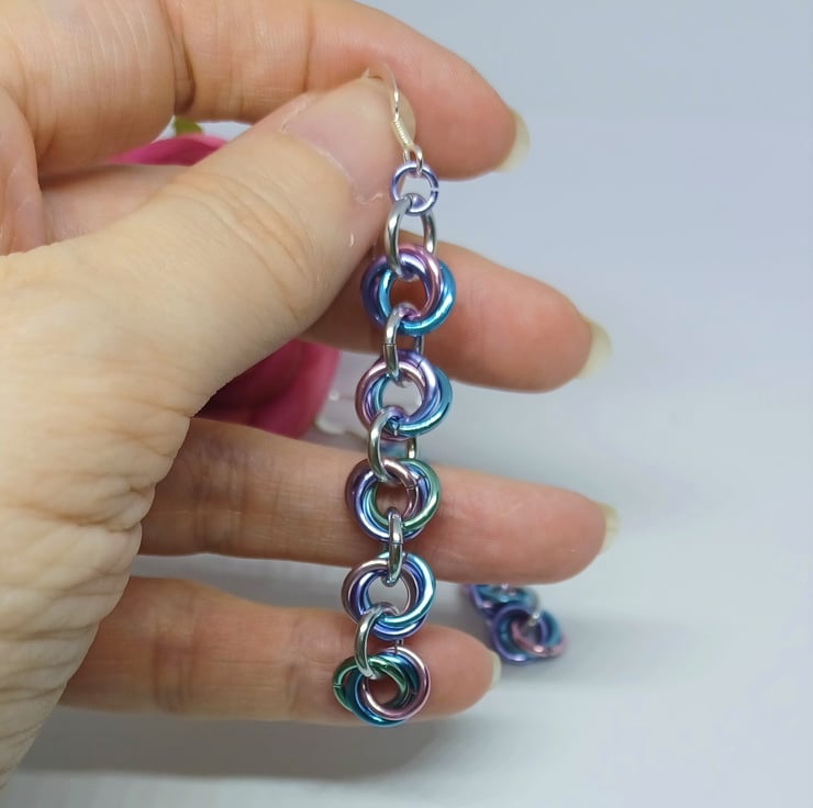 A part of my new range of chainmaille earrings. All earwires are sterling silver, and the decorative parts are anodised aluminium which means they are very lightweight to wear!