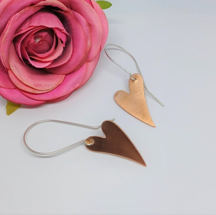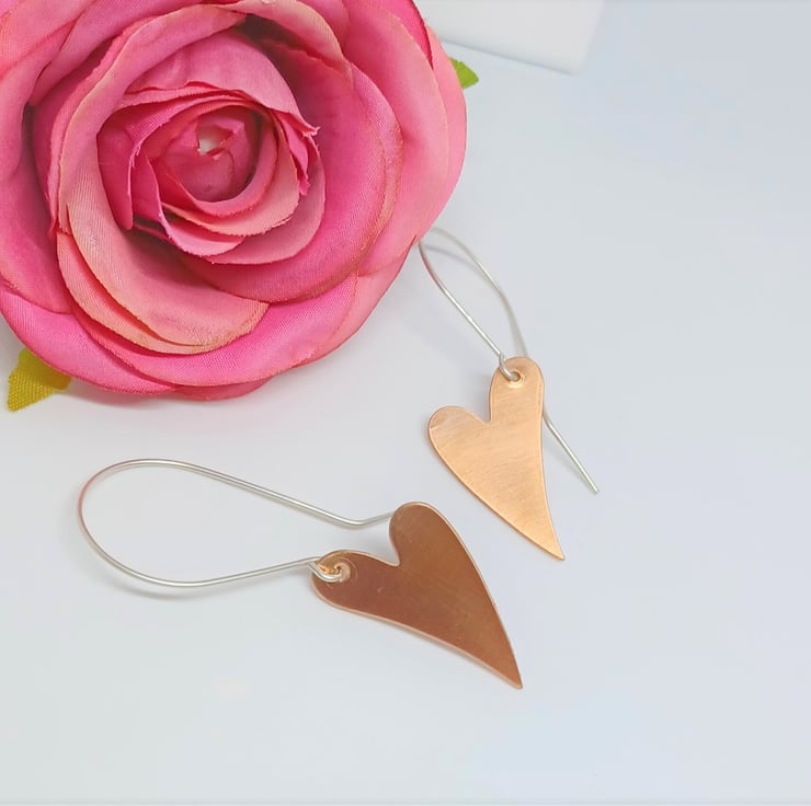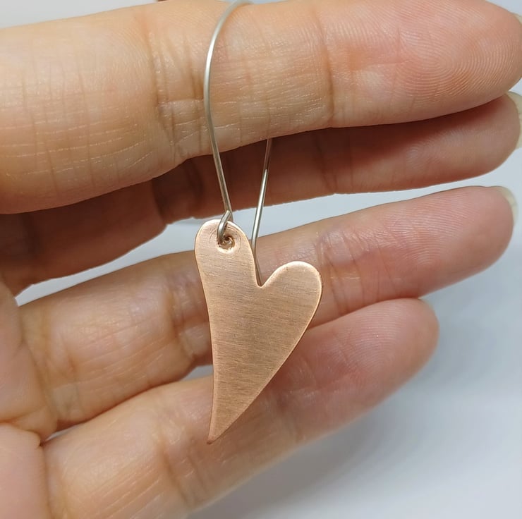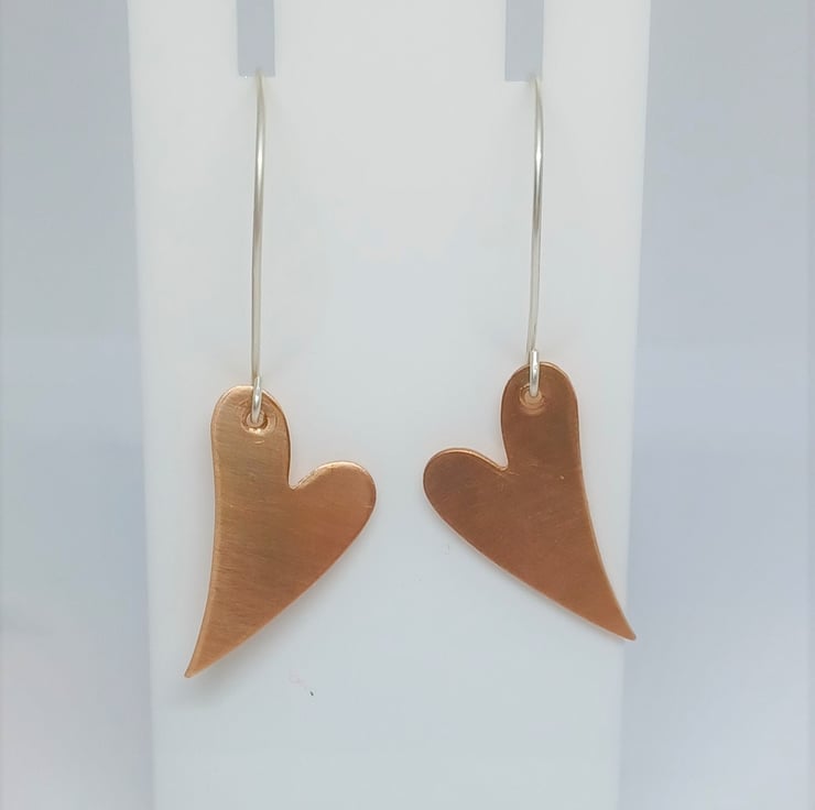 These lovely wonky copper hearts have a beautiful satin effect texture and have been added to lovely round shaped sterling silver earwires. Simple, but effective!