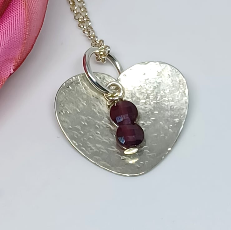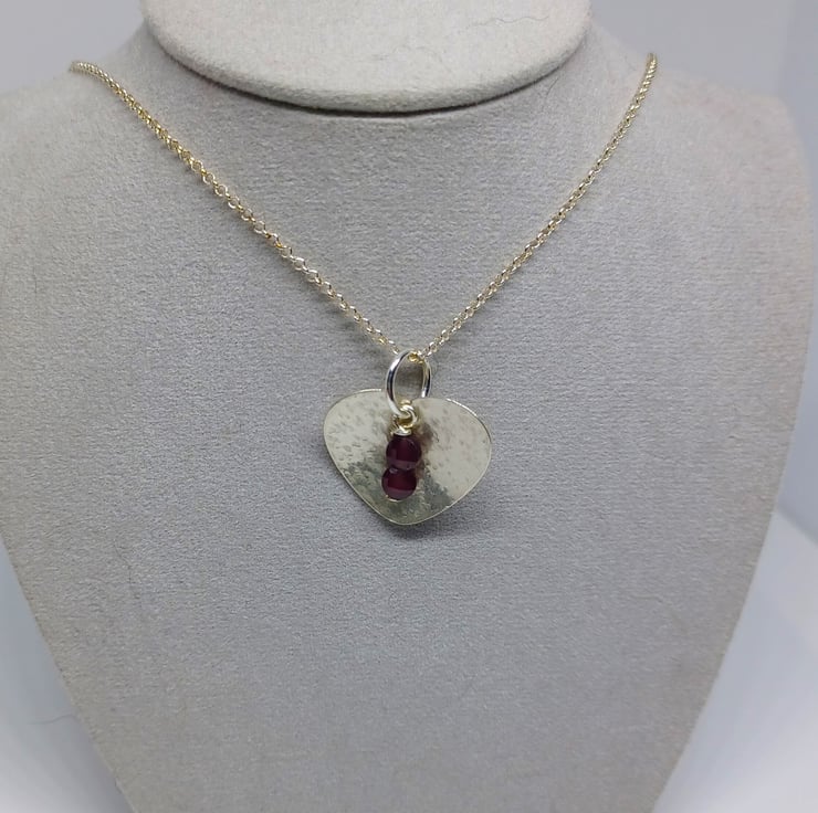 Sterling Silver Heart Pendant, Garnet and Silver Pendant, Garnet Heart Pendant, Hammered Silver Heart, Garnet Necklace, January Birthstone