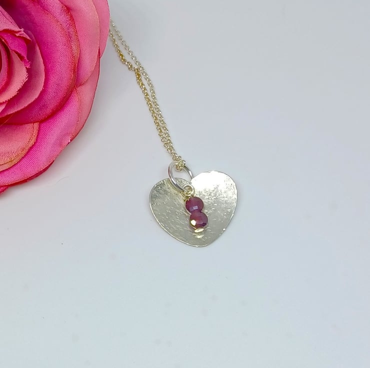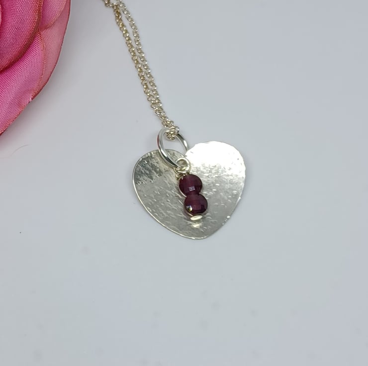 This sterling silver heart has a hammered texture which has been created using traditional silversmithing tools and techniques. It is finished with a duo of faceted garnet coins for a bit of colour and sparkle!