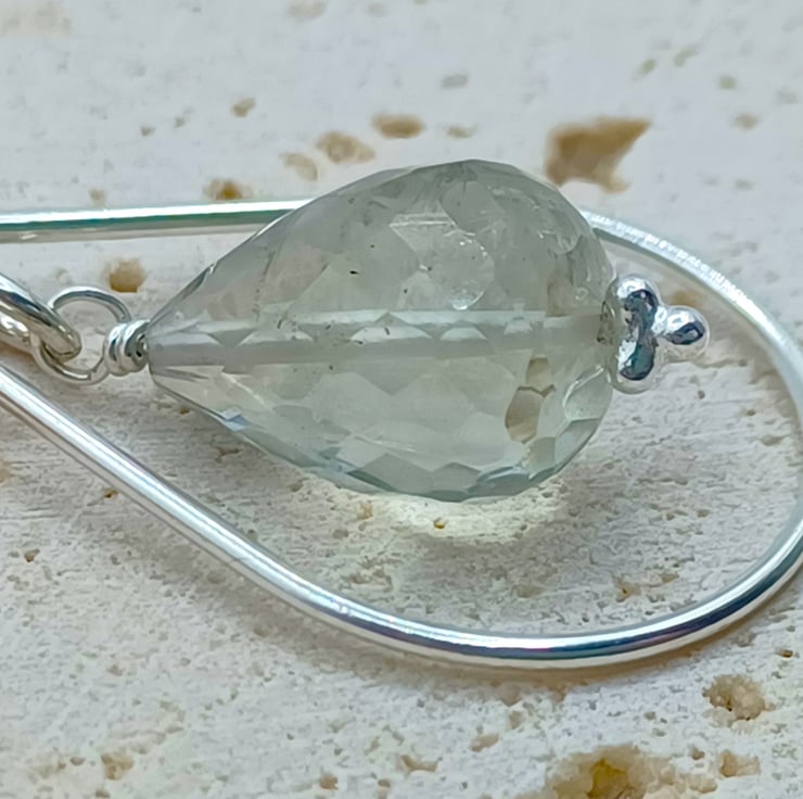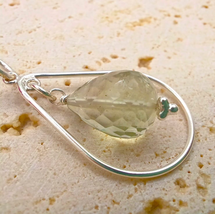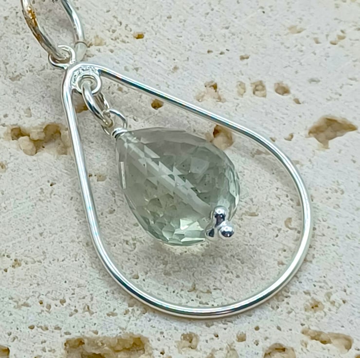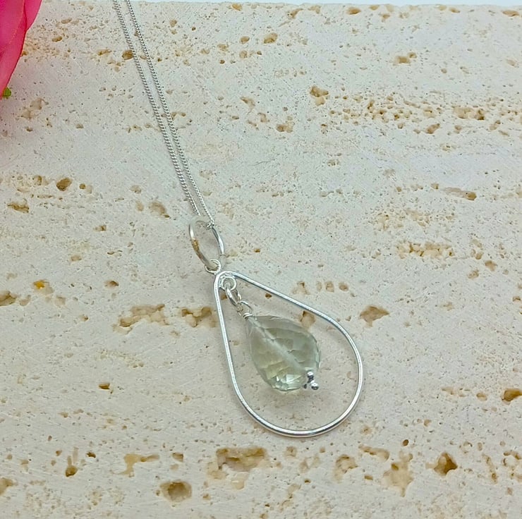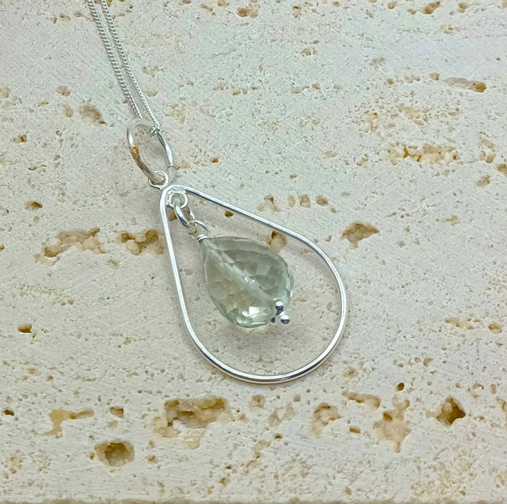 This beautiful gemstone pendant is completely hand made using sterling silver findings. It features a faceted green amethyst drop which measures approximately 15mm, suspended within a sterling silver teardrop. It is supplied on an 18 inch sterling silver chain (style may vary)