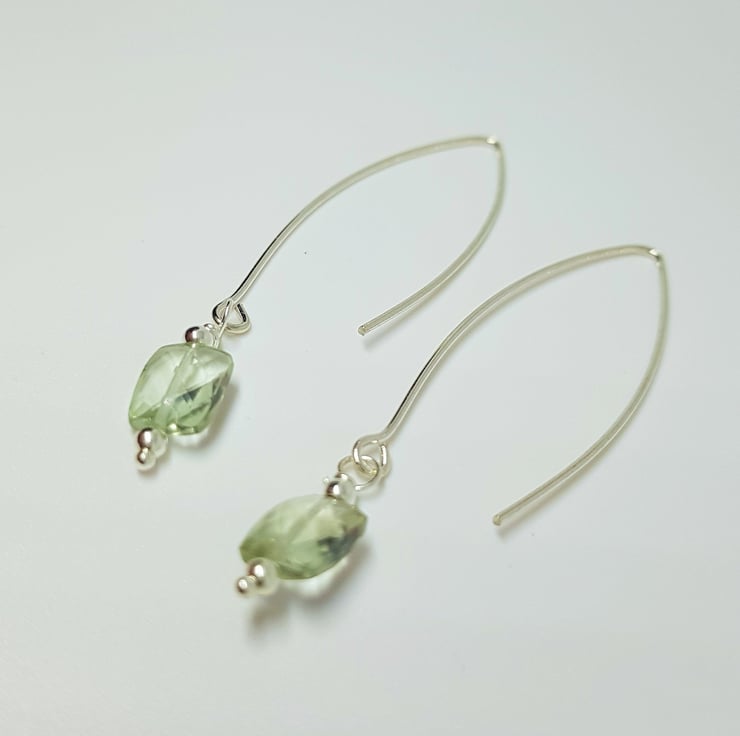 A pair of gorgeous faceted green amethyst rectangles, with tiny silver beads, set on long shaped sterling silver ear wires.