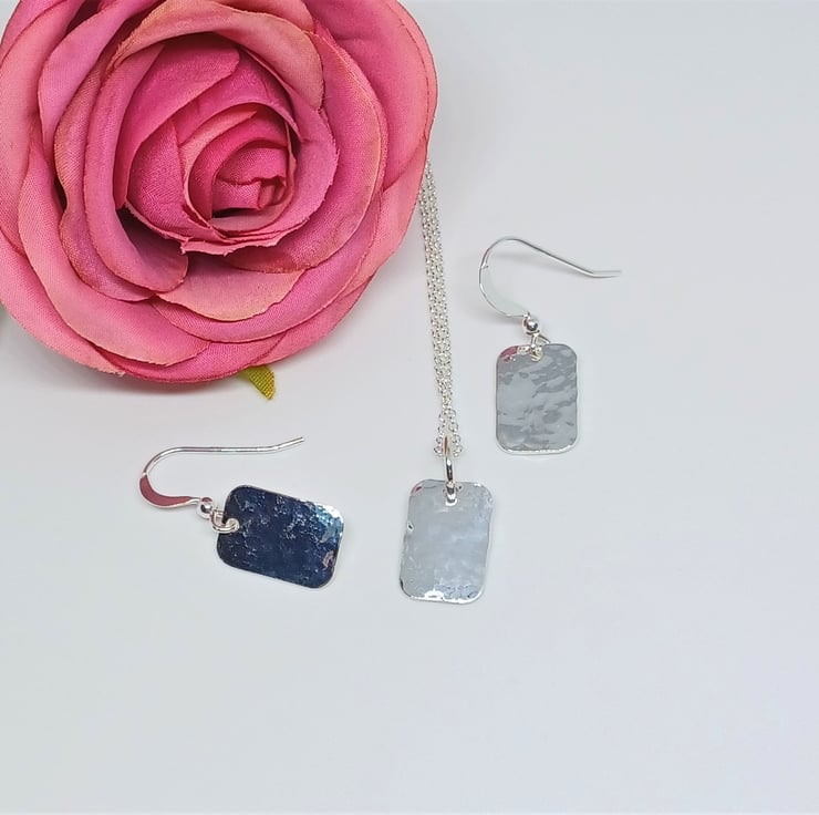 Sterling Silver Hammered Effect Rectangle Necklace and Earring Set