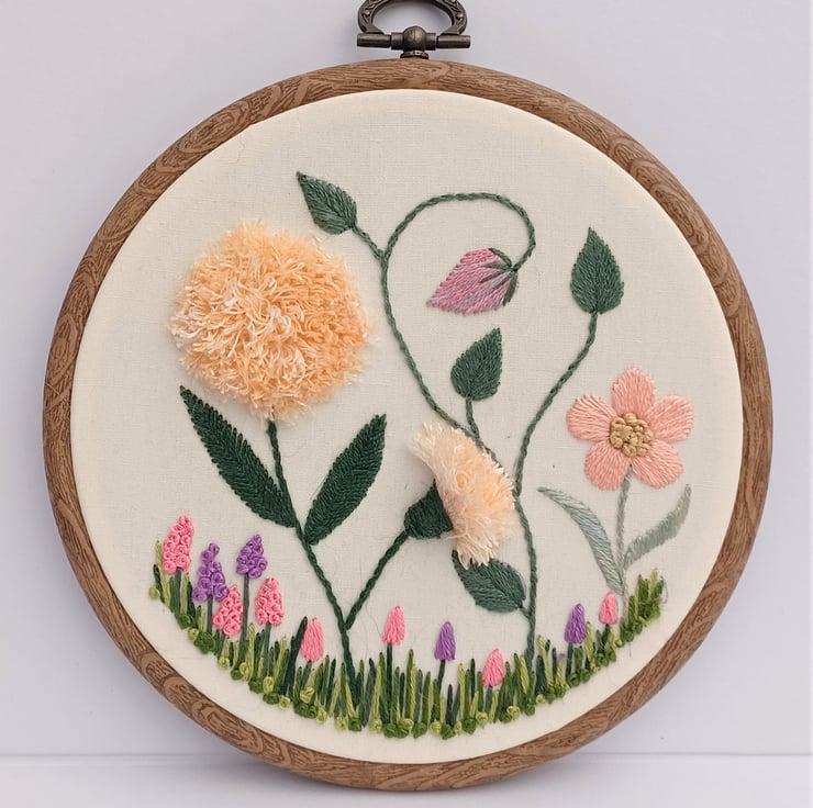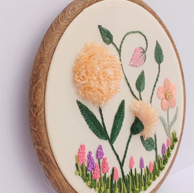 Stumpwork is a traditional form of embroidery that uses different techniques to make 3D elements. The hoop features a variety of wildflowers, including super fluffy dandelions!