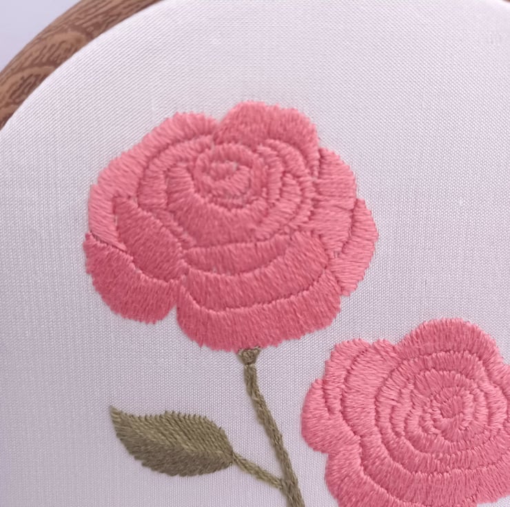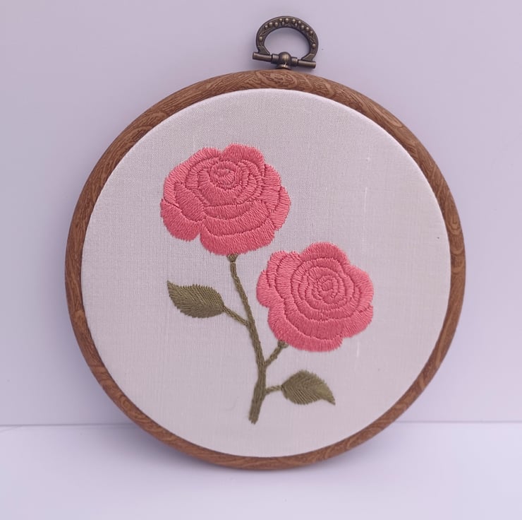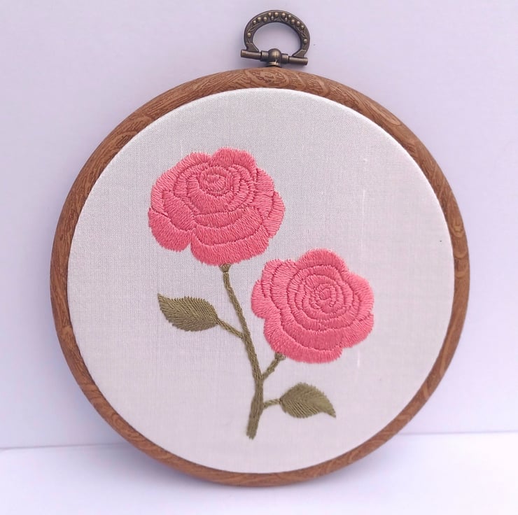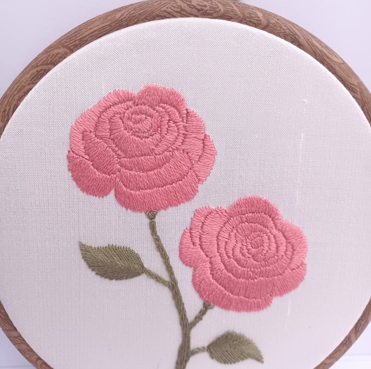 This pink rose design is hand stitched using silk threads on to a silk base. The pink roses are framed in a 6 inch hoop