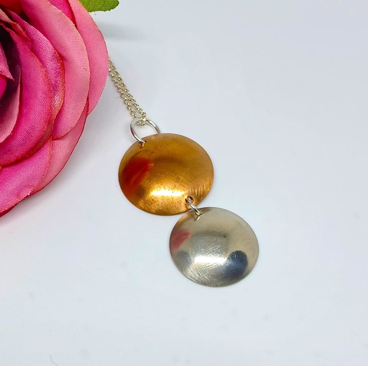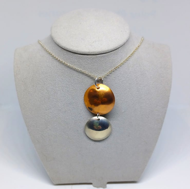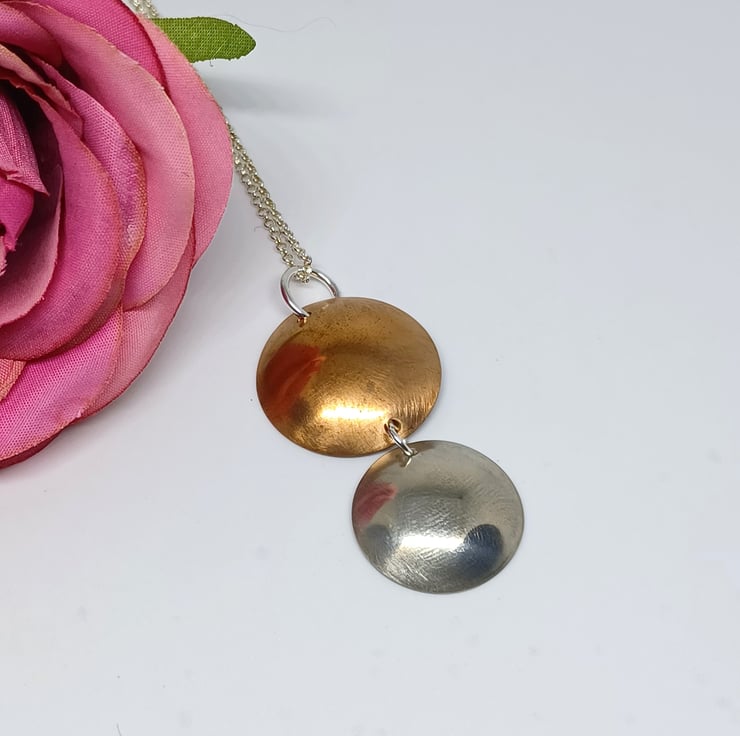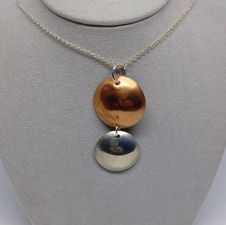 A lovely mixed metal pieces , this lovely pendant comprises of copper and silver discs, that have been domed, and highly polished. Supplied on an 18 inch sterling silver chain (design may vary)