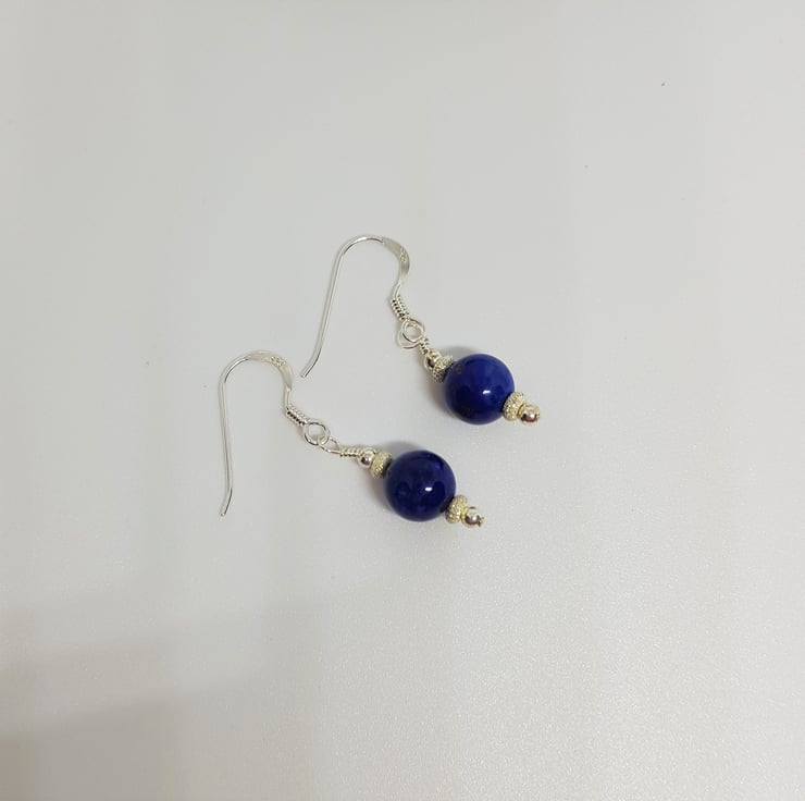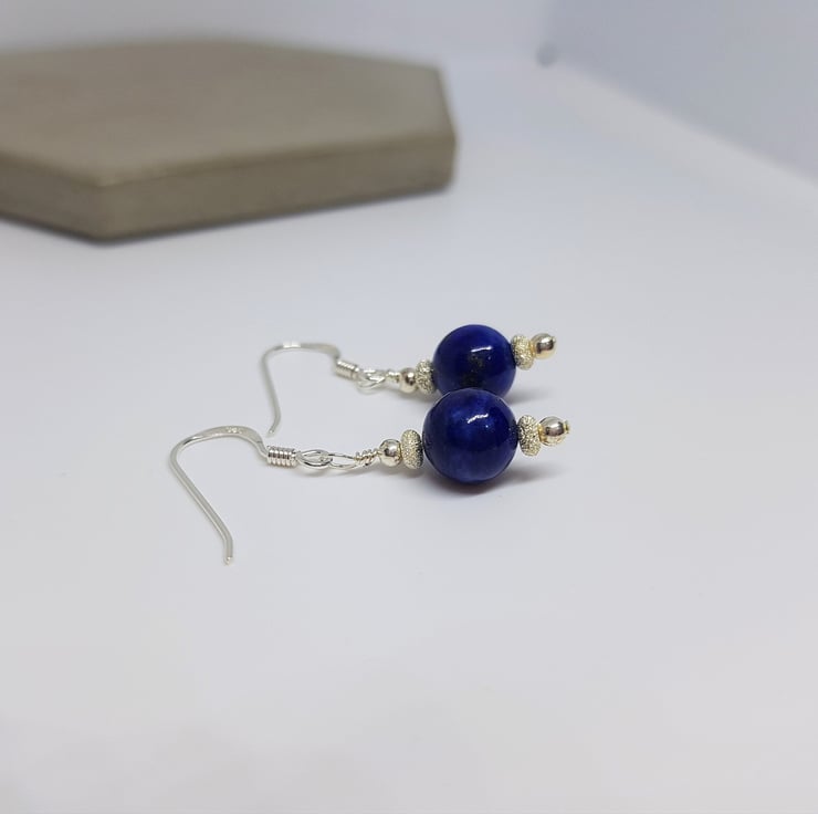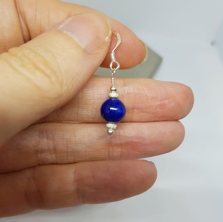 These 8mm Lapis Lazuli beads are highlighted by sterling silver rondelles, and some extra sparkly silver beads. They are suspended from Sterling Silver earwires.