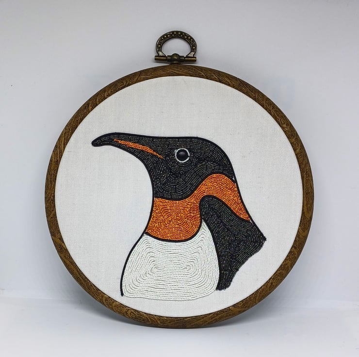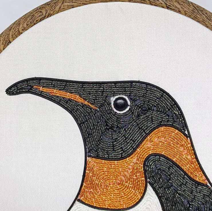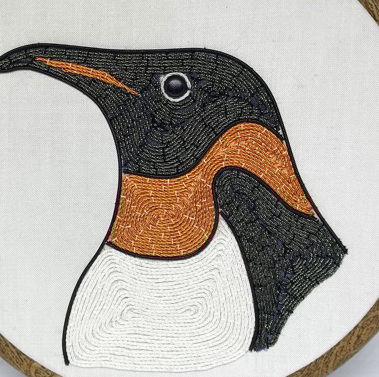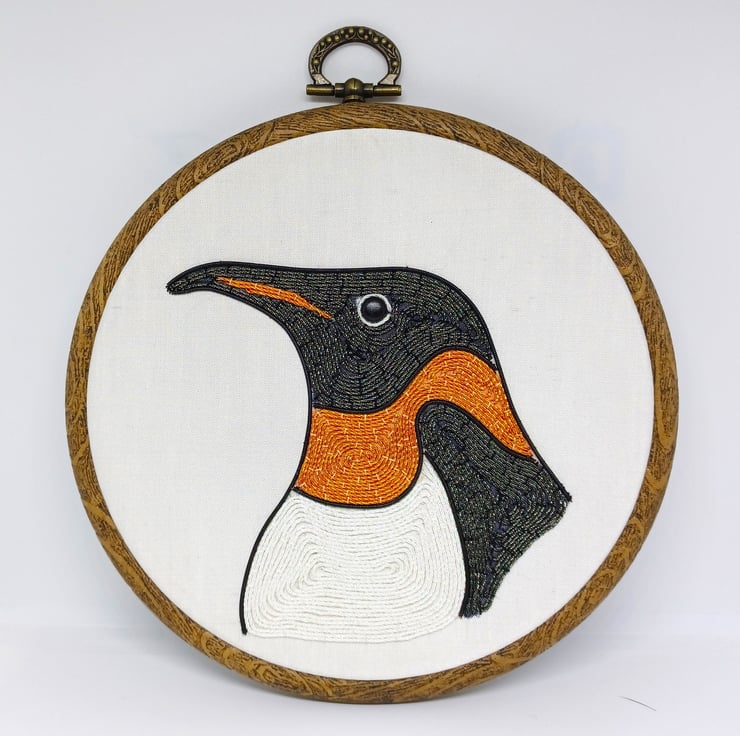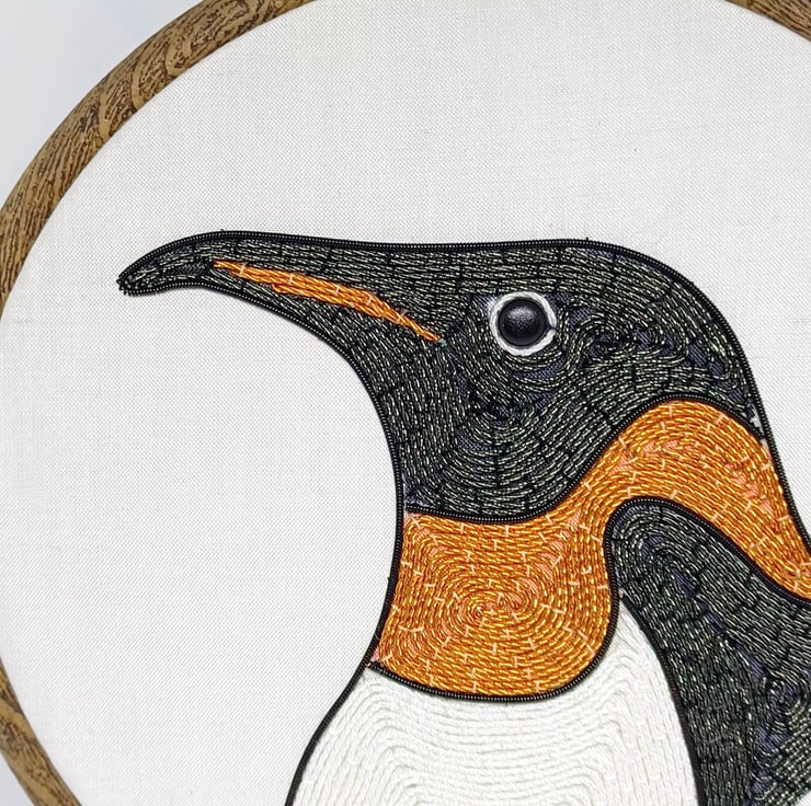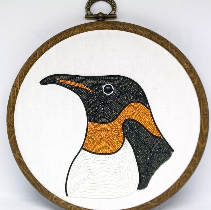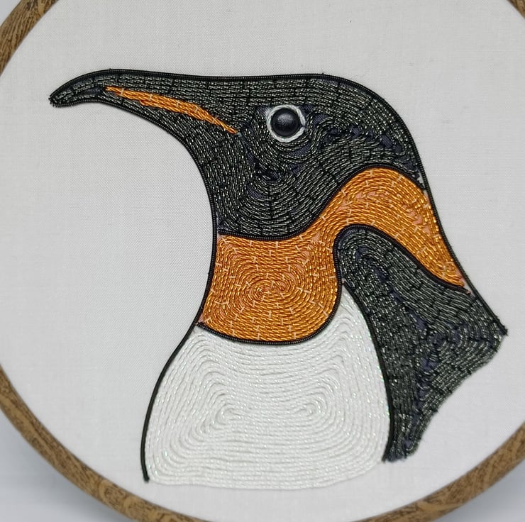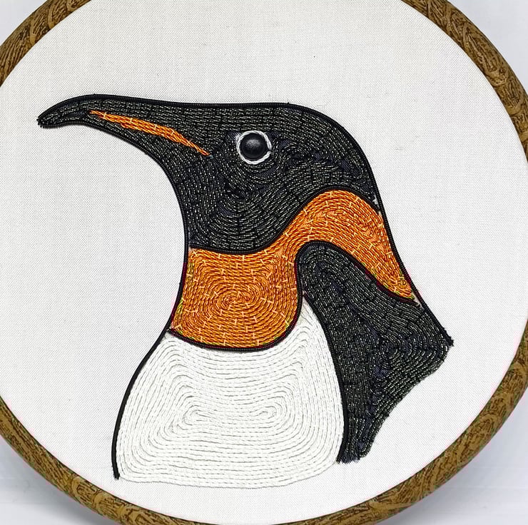 The penguin is hand stitched using a variety of goldwork wires on to a white silk backing, and is framed in a six inch hoop.