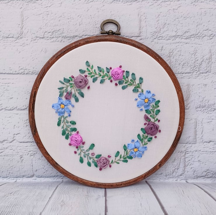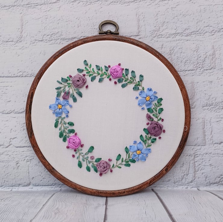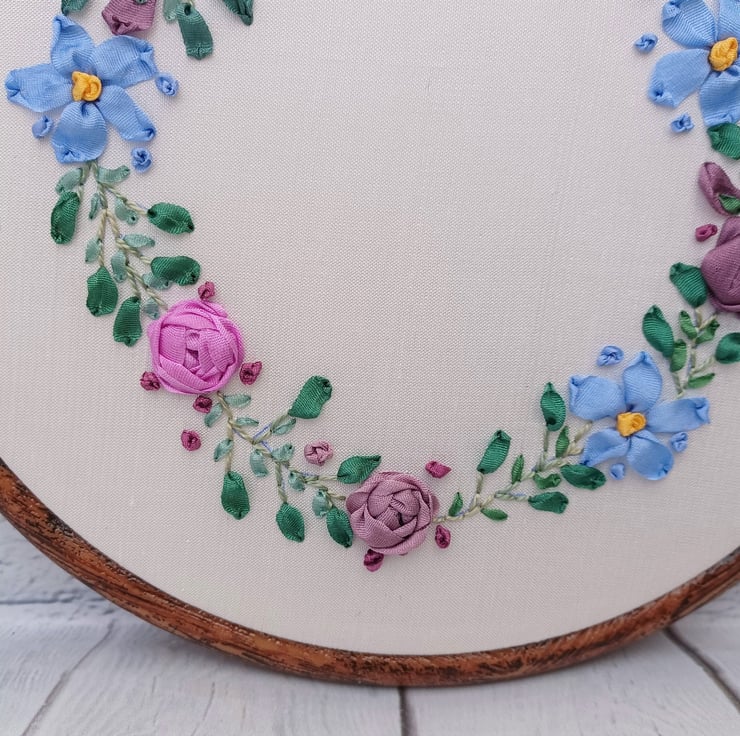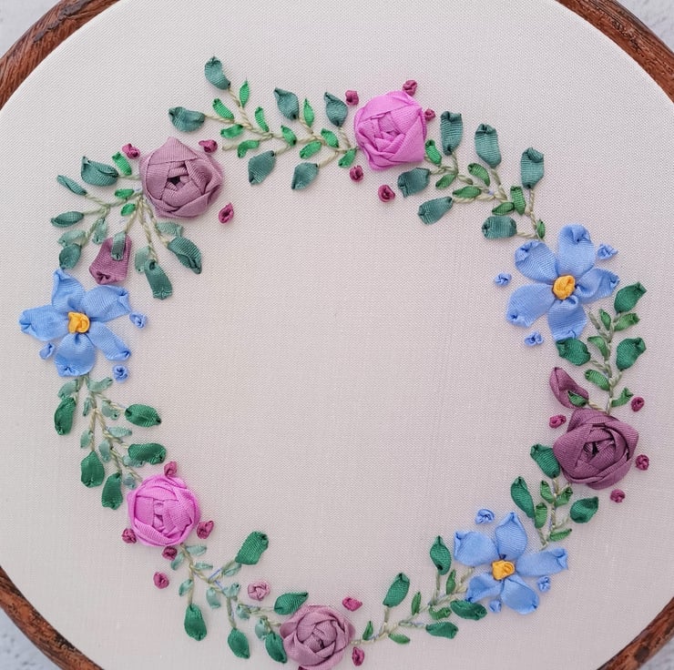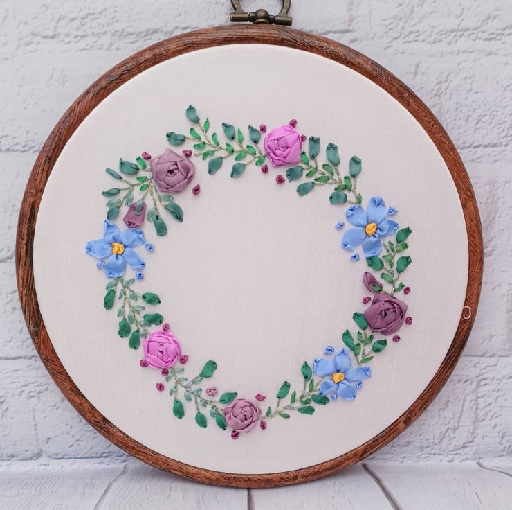 The silk ribbon roses and forget me nots wreath is completely hand embroidered using silk ribbons, on to a silk fabric base. The circle wreath has a white silk base, and is framed in a 5 inch hoop.