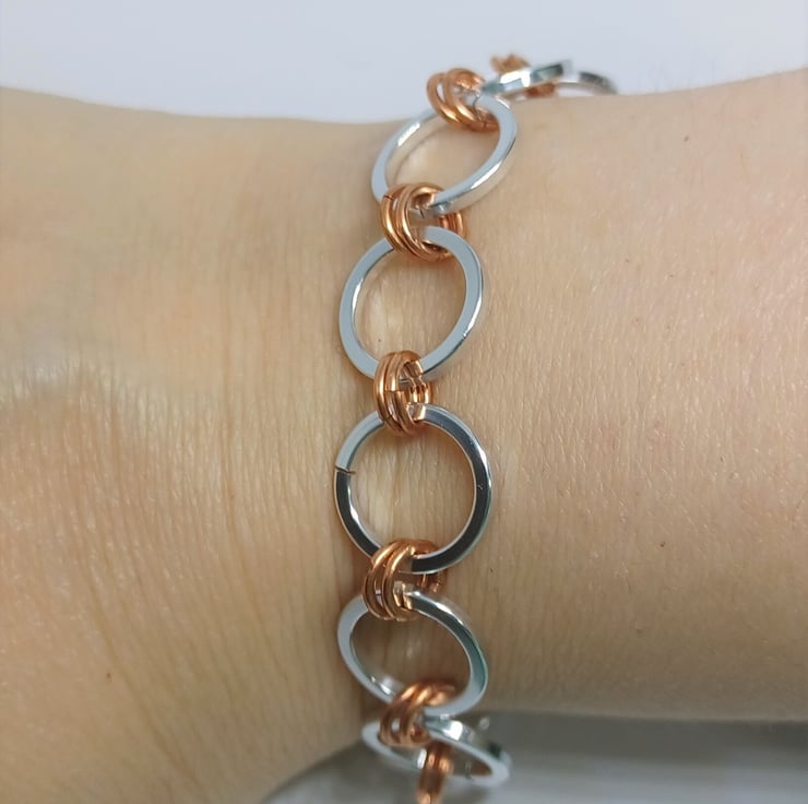 This bracelet is silver and copper coloured rings, and to add that extra detail, the silver rings are made of a square wire. The bracelet measures approximately 7.5 inches, and fastens with a lobster claw clasp.