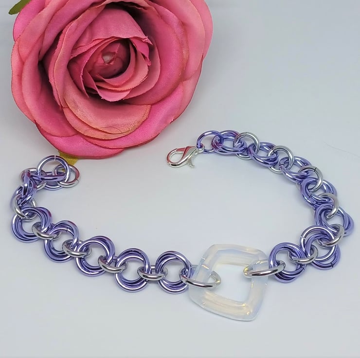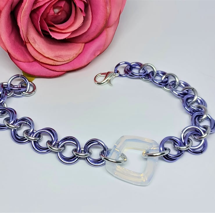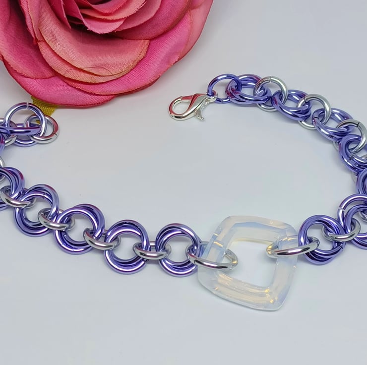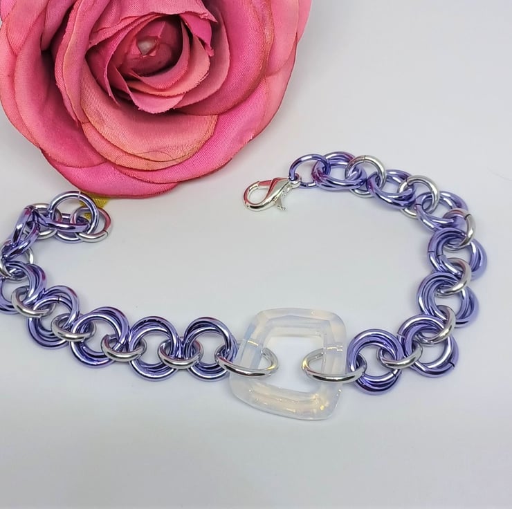 Purple Colour Anodized Aluminium Mobius Rose Chainmaille Bracelet with AB Crystal Focal Link