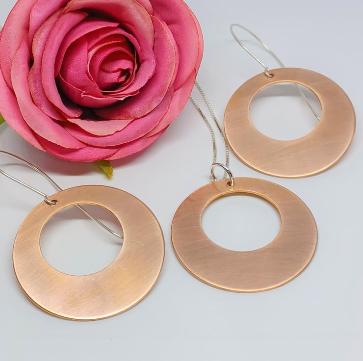 A set of polished copper cut out disc pendant and matching earrings. All are made using traditional metalsmithing tools and techniques. All earwires and findings are sterling silver. All pendants are supplied on an 18inch sterling silver chain (style may vary)
