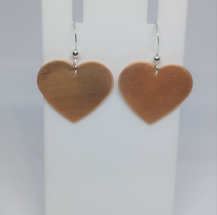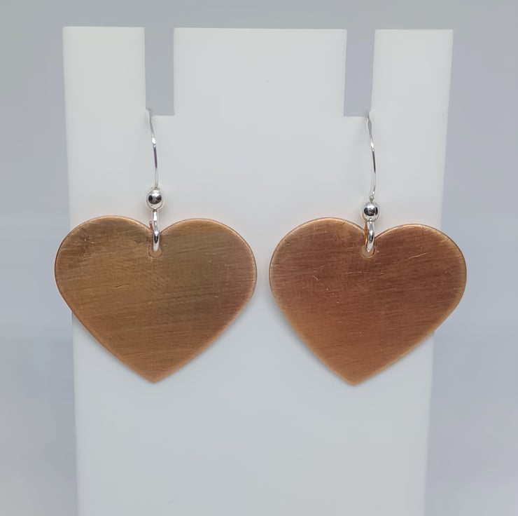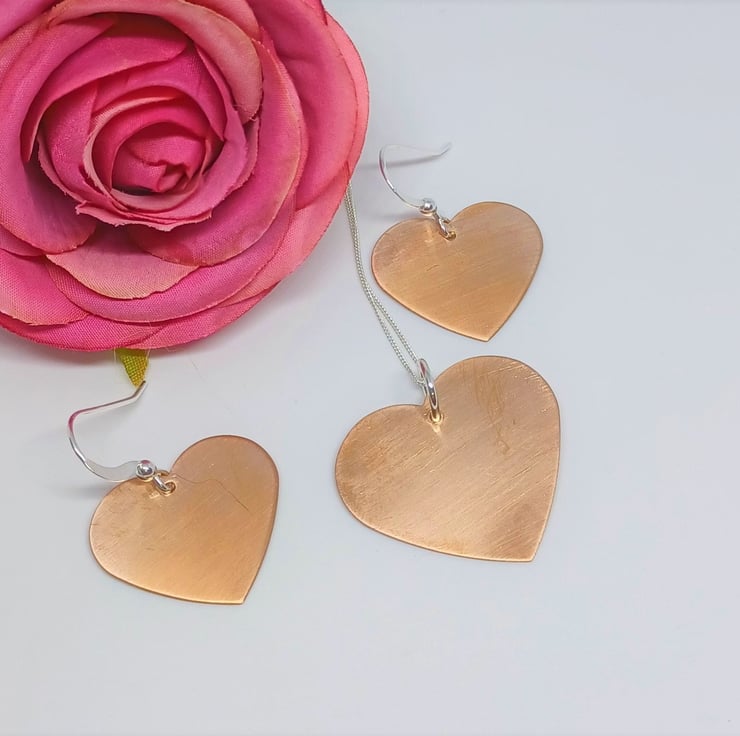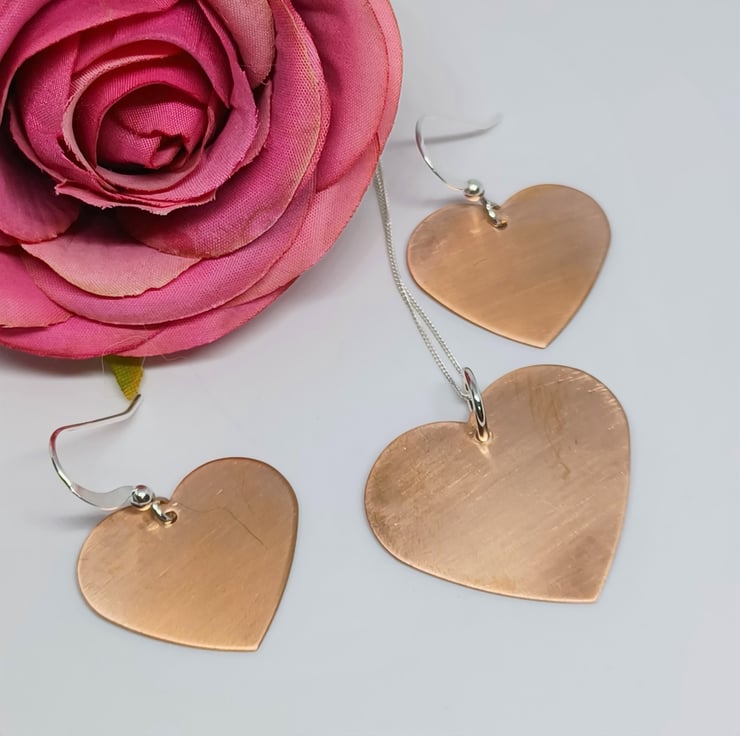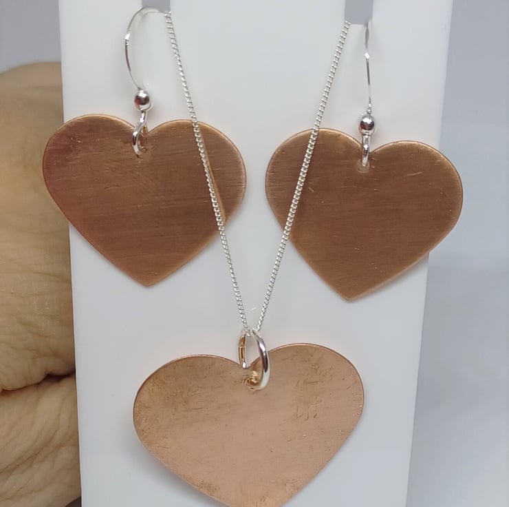 A set of satin effect copper heart pendant and matching earrings. All are made using traditional metalsmithing tools and techniques. All earwires and findings are sterling silver. All pendants are supplied on an 18inch sterling silver chain (style may vary)