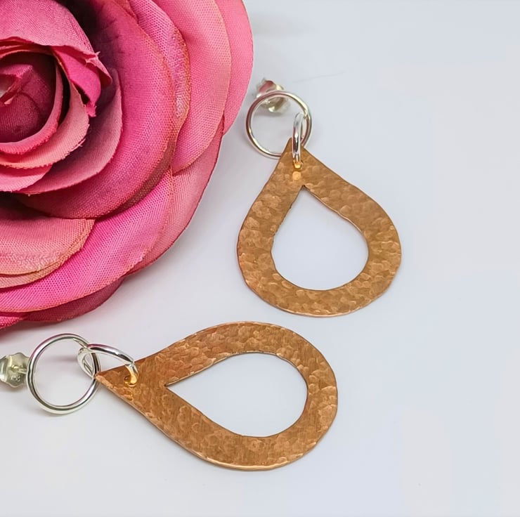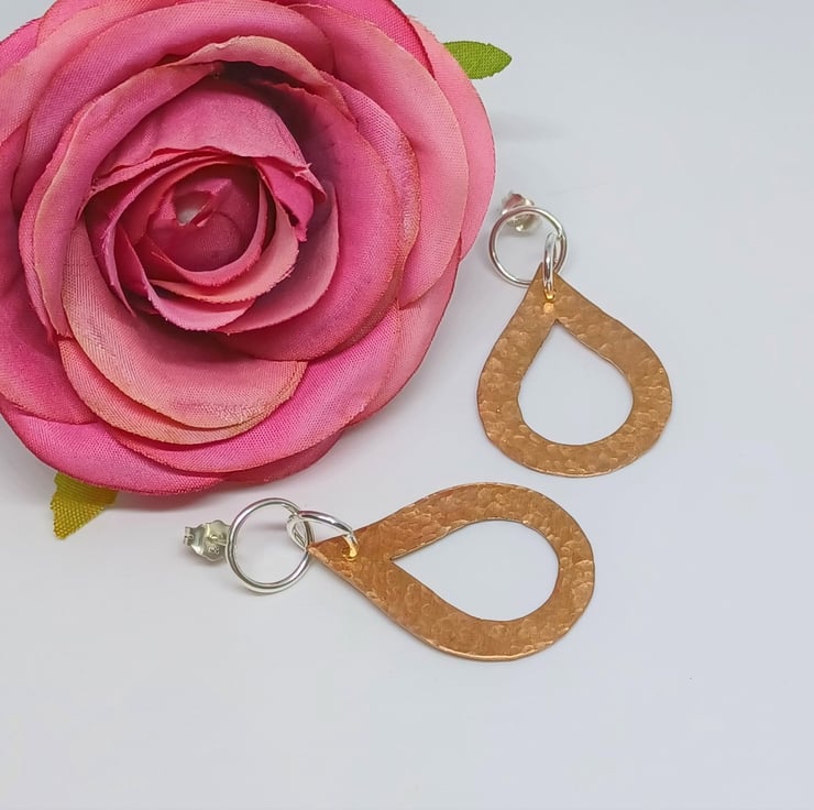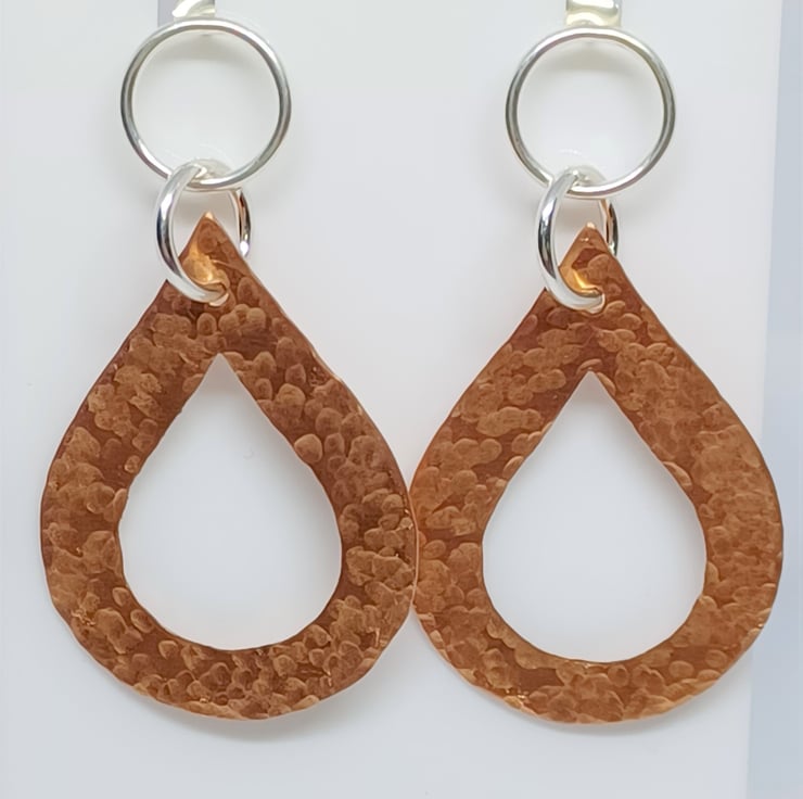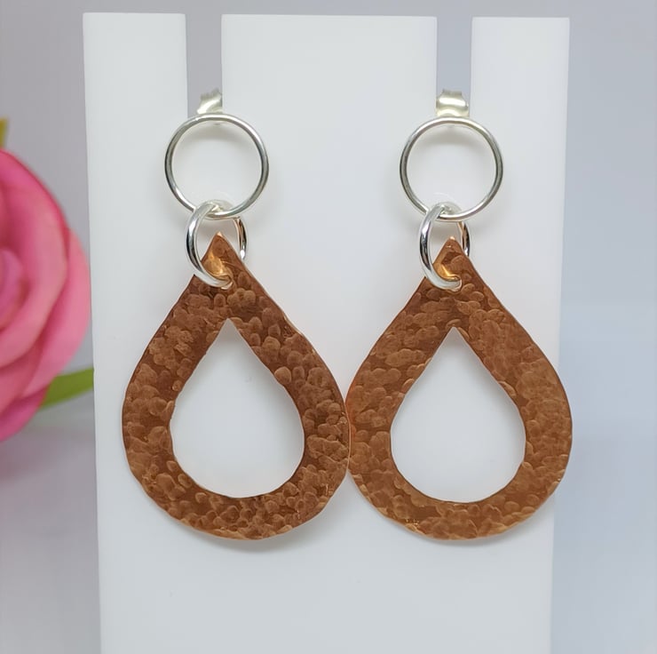 Gorgeous hammered texture copper open teardrops suspended from circle sterling silver earstuds with butterfly backs. These are elegant, and classy, and perfect for dressing up or down. All earwires and components are sterling silver.