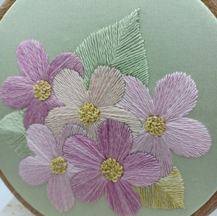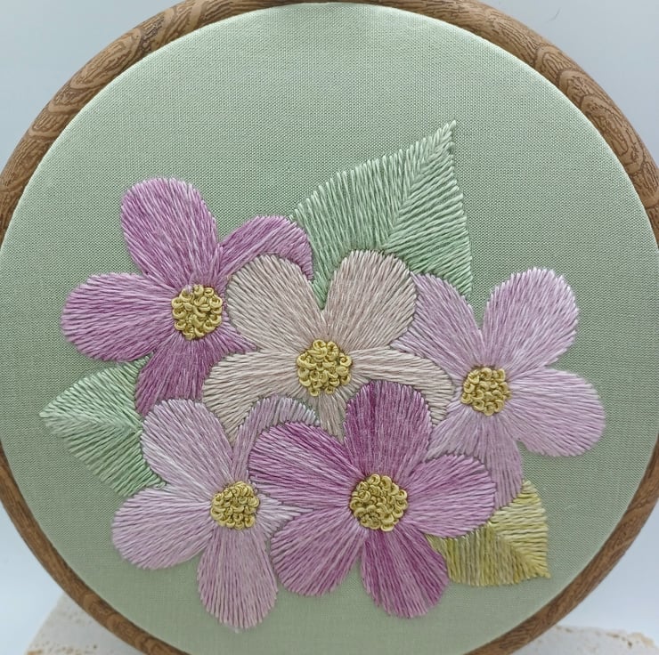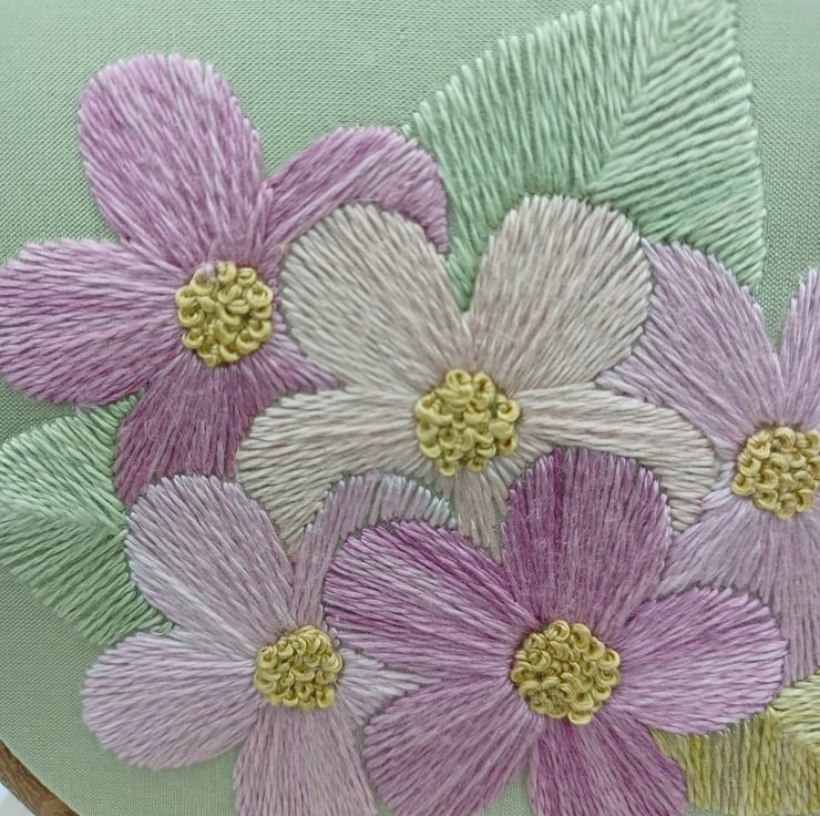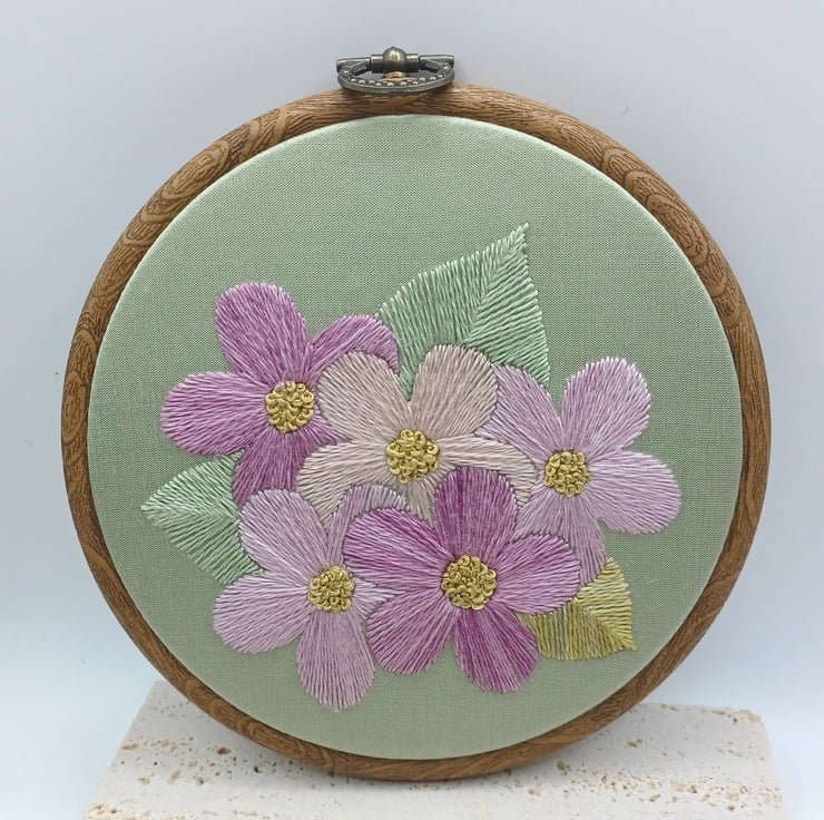 This pretty hoop is full of hand embroidered flowers, stitched using 100% silk threads on to a gorgeous pale green silk base.