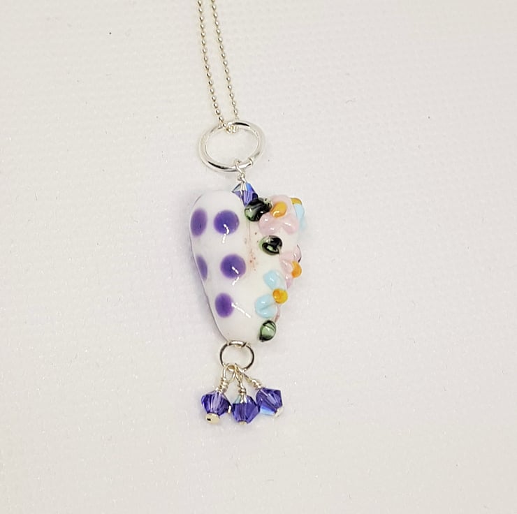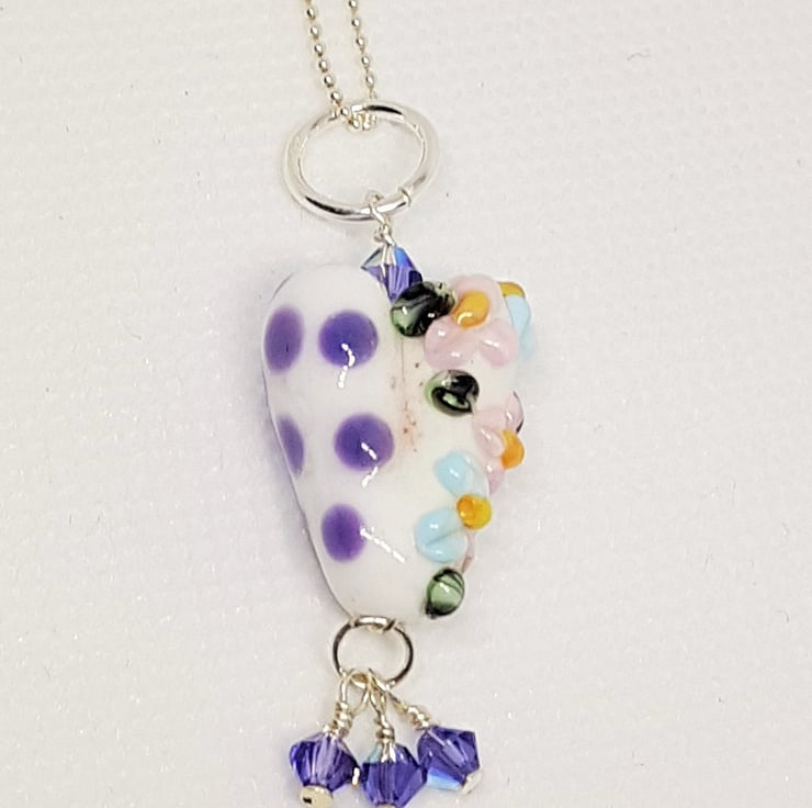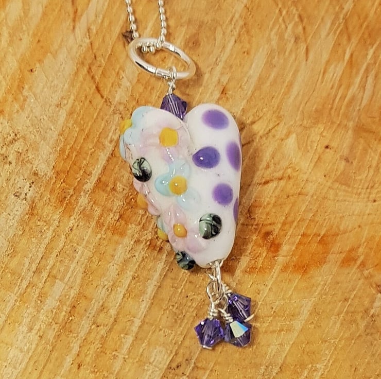 Purple Spotty Lampwork Glass Heart with Flowers This beautiful necklace has been made from my stash of lampwork glass hearts from some amazing glass artists, that I have been collecting over a number of years. It has been combined with sterling silver findings, and finished with Swarovski crystals for a little bit of sparkle!