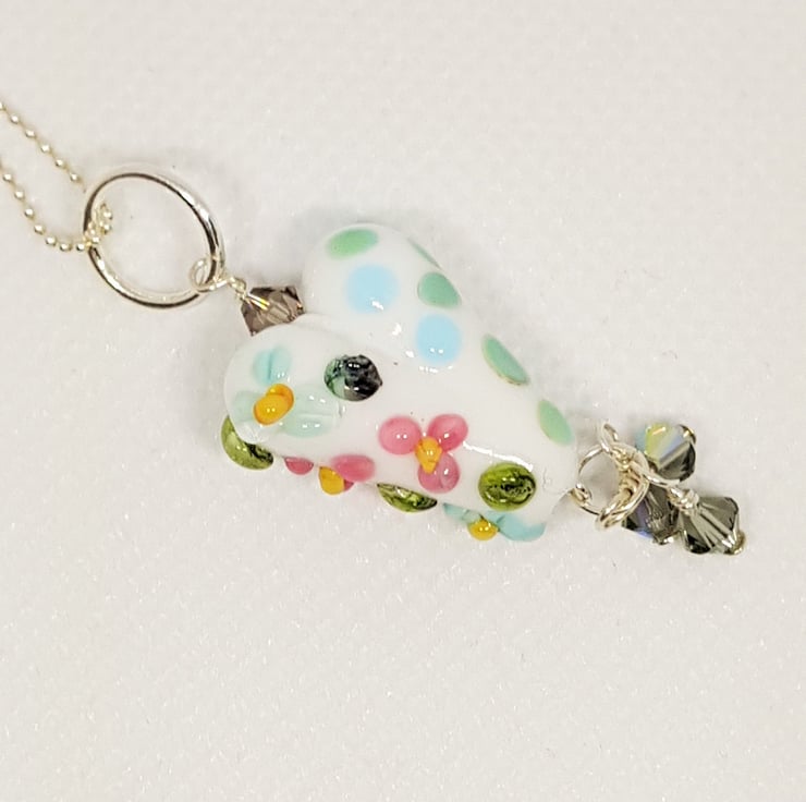 Blue Spotty Lampwork Glass Heart with Flowers This beautiful necklace has been made from my stash of lampwork glass hearts from some amazing glass artists, that I have been collecting over a number of years. It has been combined with sterling silver findings, and finished with Swarovski crystals for a little bit of sparkle!