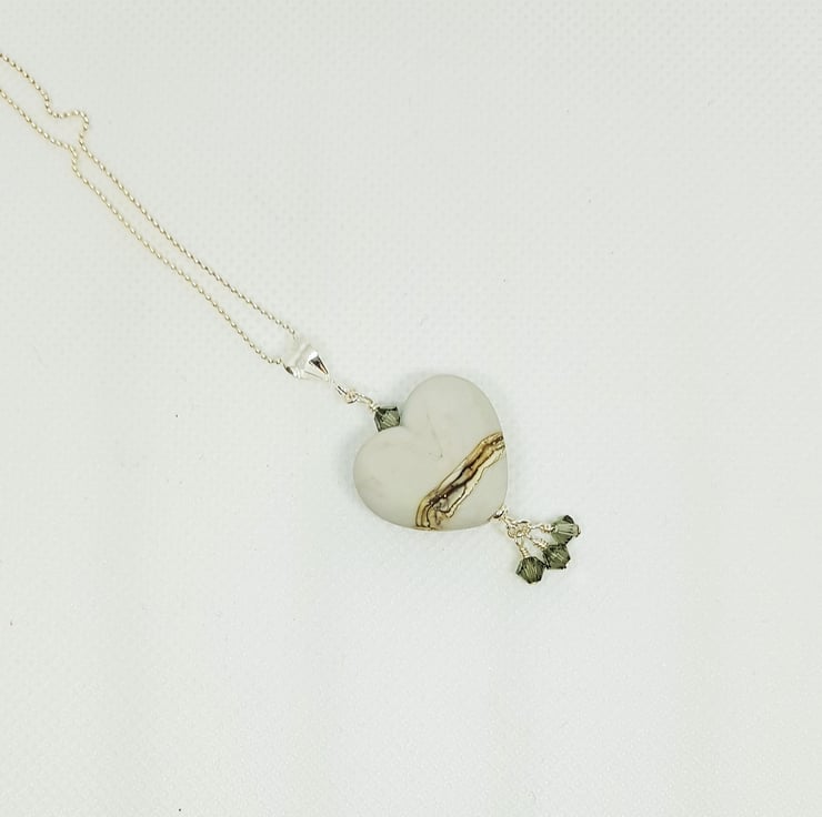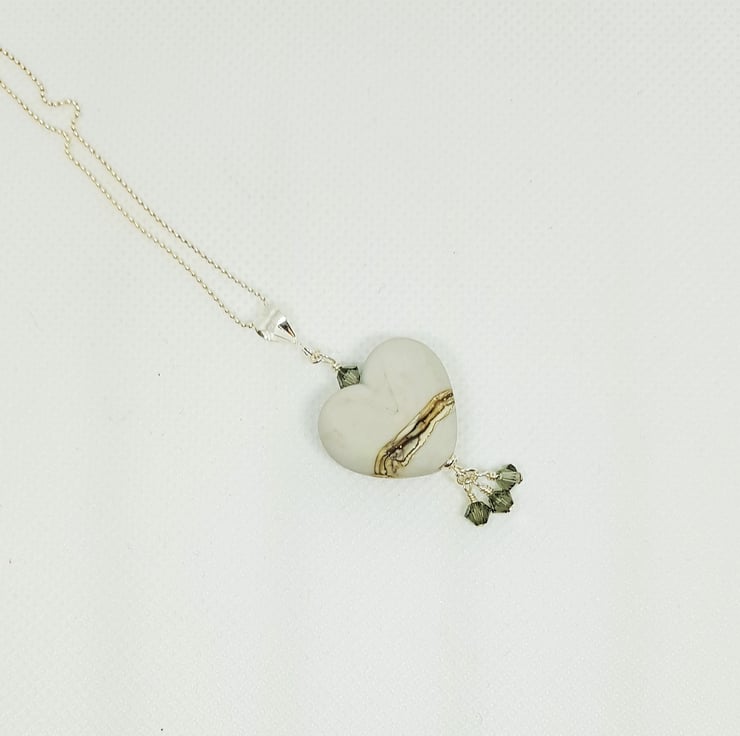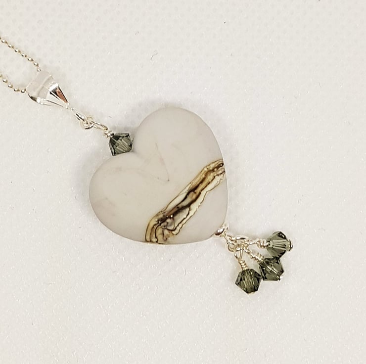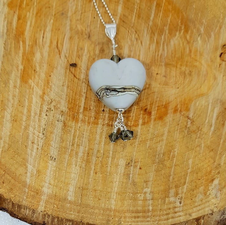 Grey Lampwork Glass Heart This beautiful necklace has been made from my stash of lampwork glass hearts from the amazing glass artist Sally Sutherland. It has been combined with sterling silver findings, and finished with Swarovski crystals for a little bit of sparkle!
