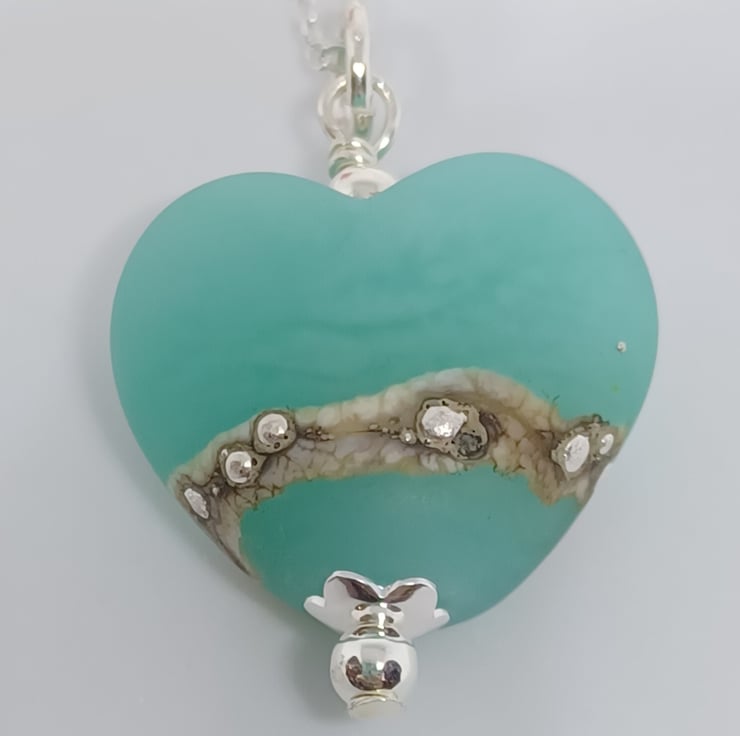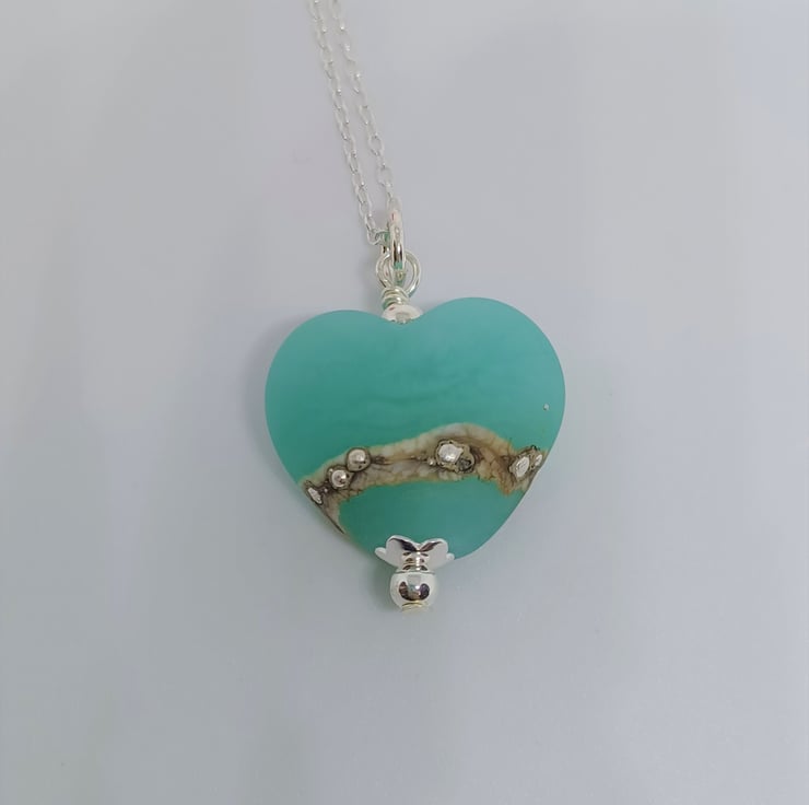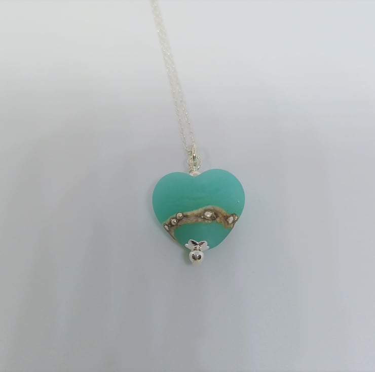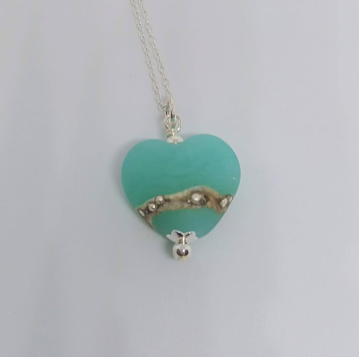Light Teal Blue Lampwork Glass Heart Focal Bead Necklace on sterling silver chain, Glass Heart Pendant