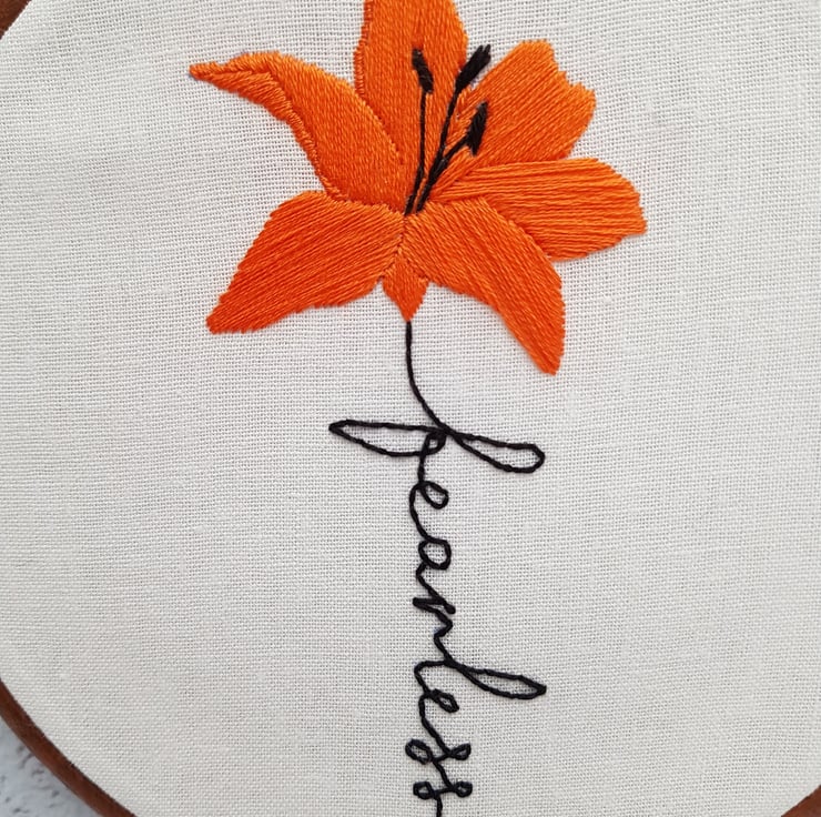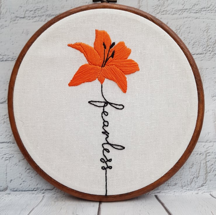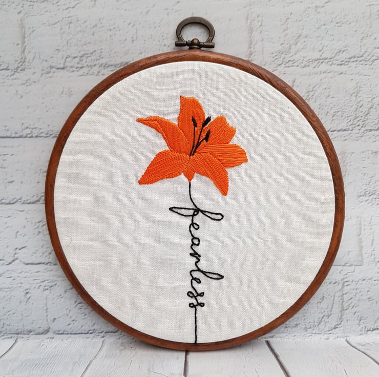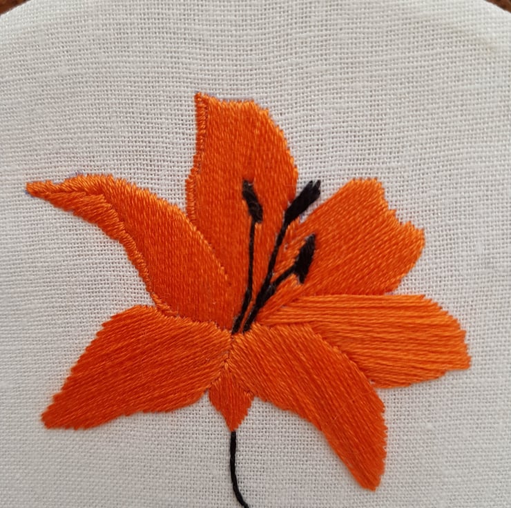 This beautiful orange lily is completely hand embroidered on to linen, and framed in a 6 inch frame with integral hanger.
