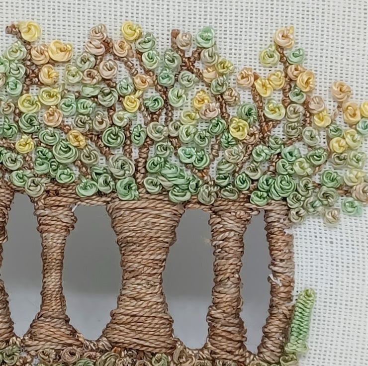 This is my variation on Hardanger, or cut work embroidery - it involves very carefully removing certain base threads in your fabric, and stitching in a certain way. There are also slightly 3D elements in the foliage.