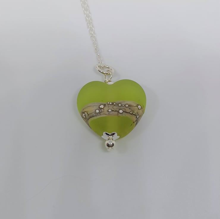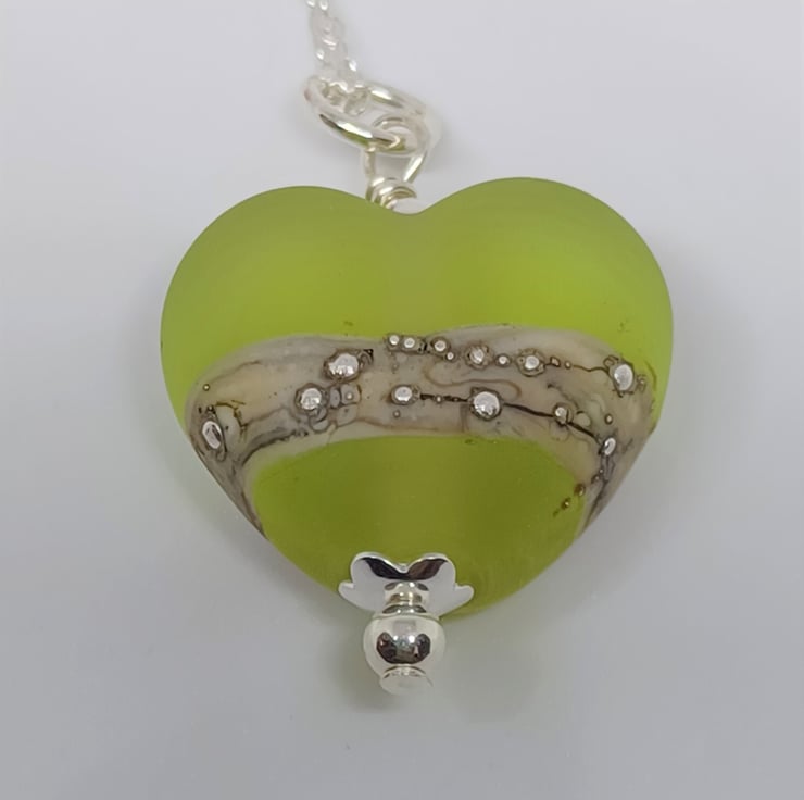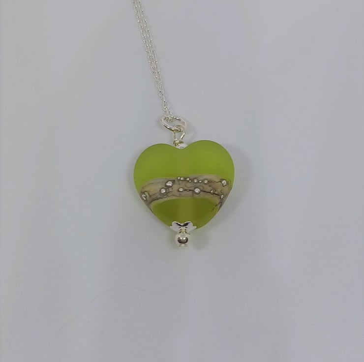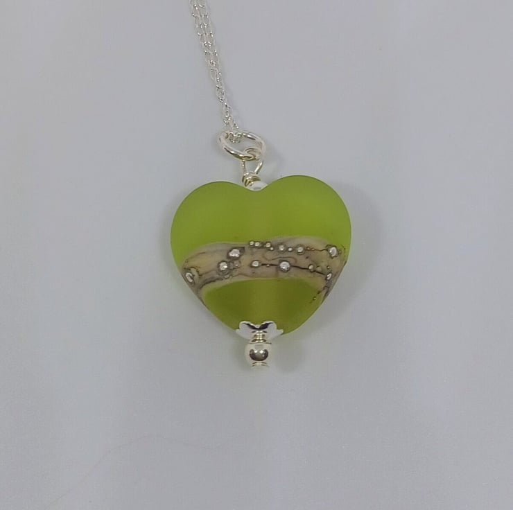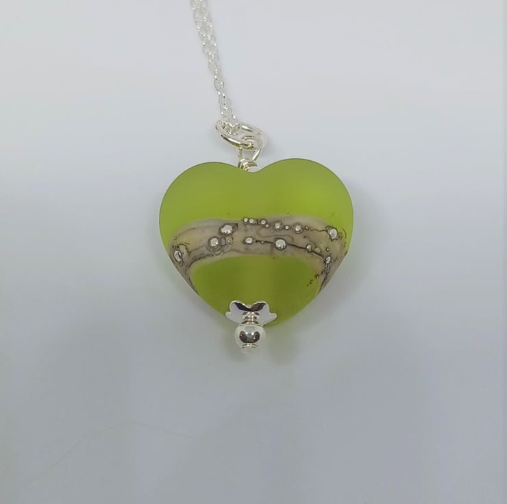 Green Lampwork Glass Heart Focal Bead Necklace on sterling silver chain, Glass Heart Pendant