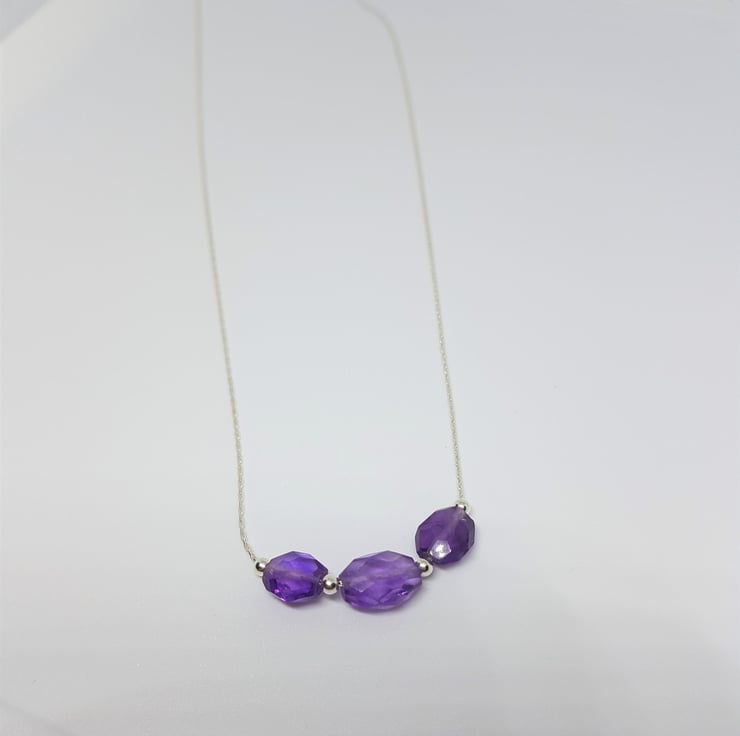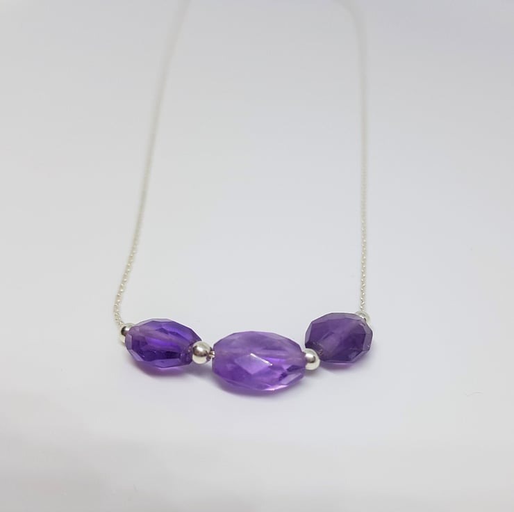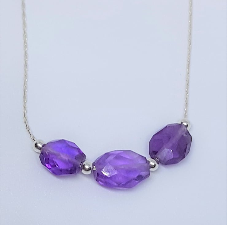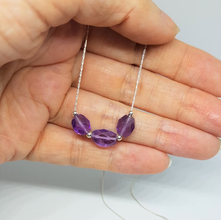 The necklace features a trio of amethysts set onto a sterling silver beading chain. They are not fixed in place, to allow flow of movement. They are great for fiddling with!