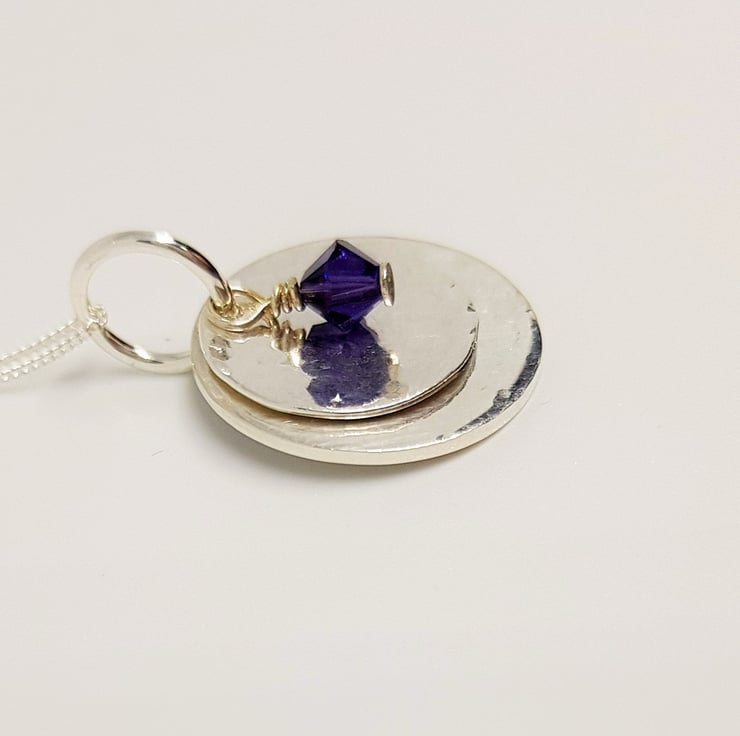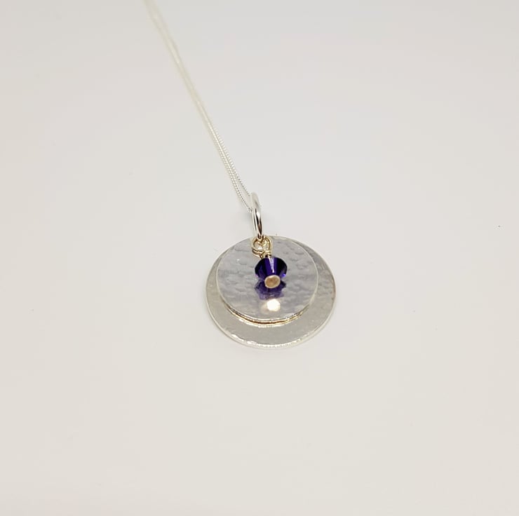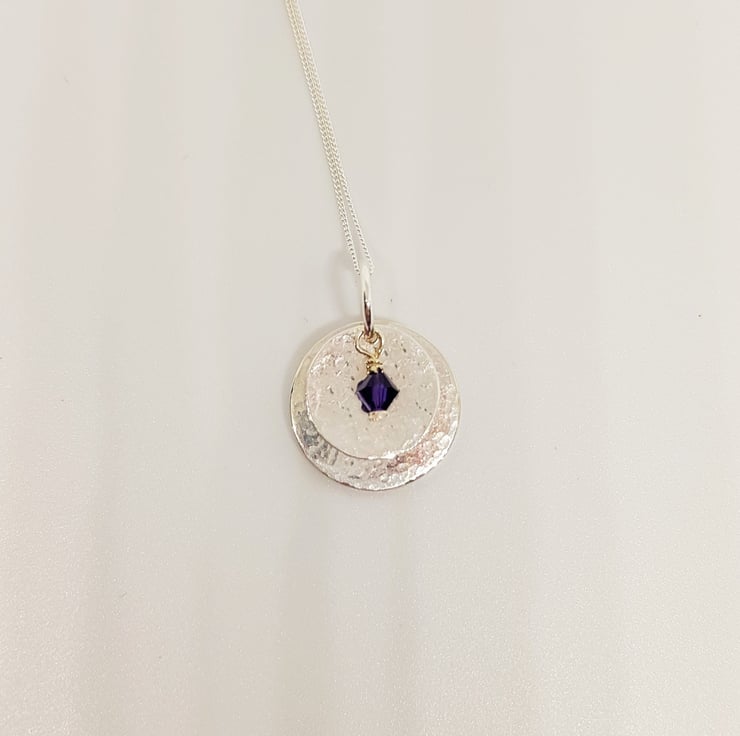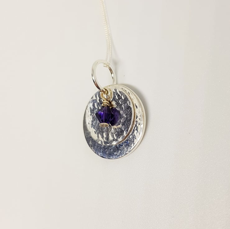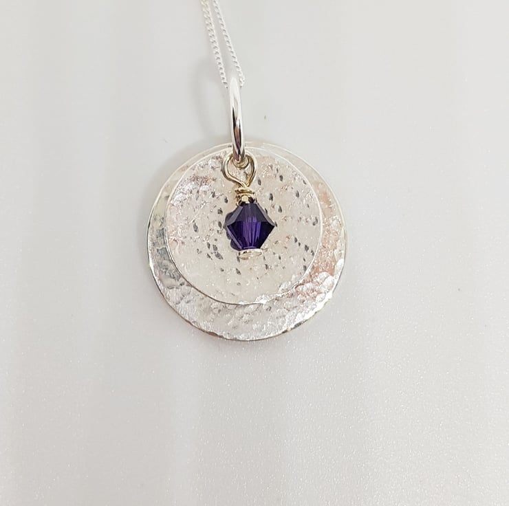 This pretty pendant features two hand textured sterling silver discs, with a tiny purple Swarovski crystal. It is pretty, dainty, and could be worn every day!