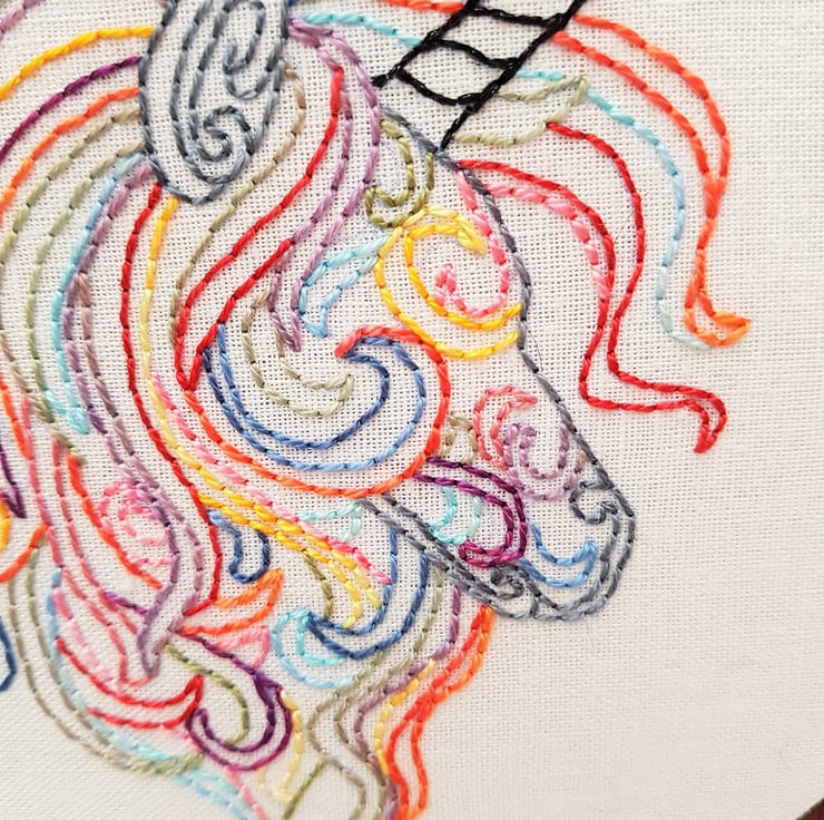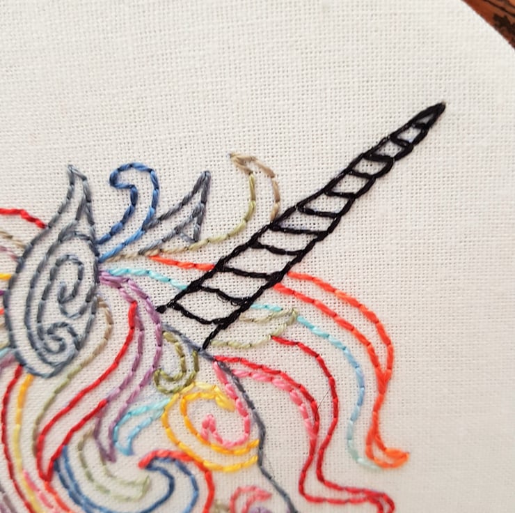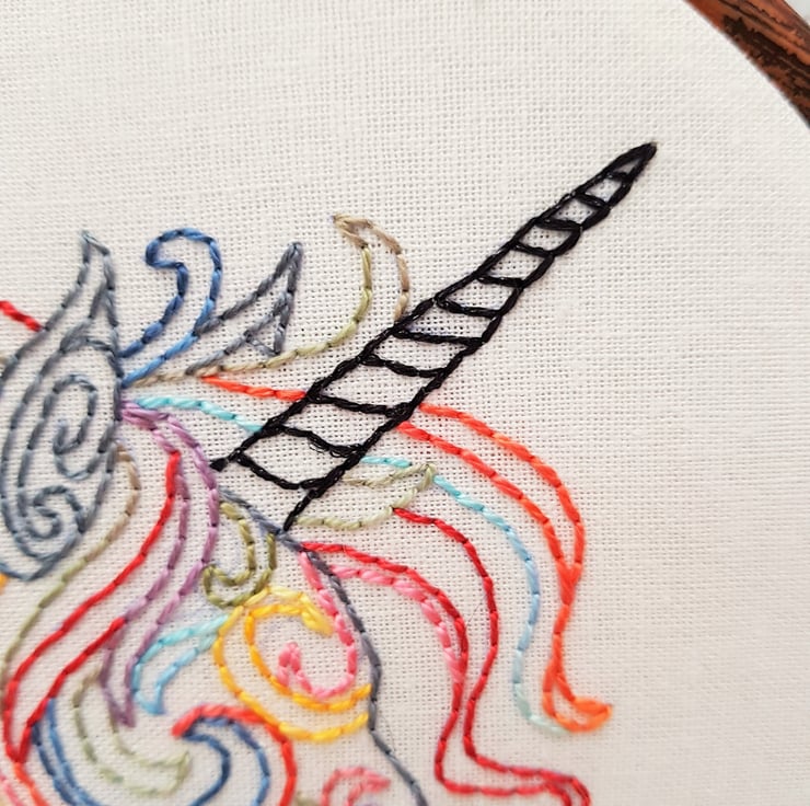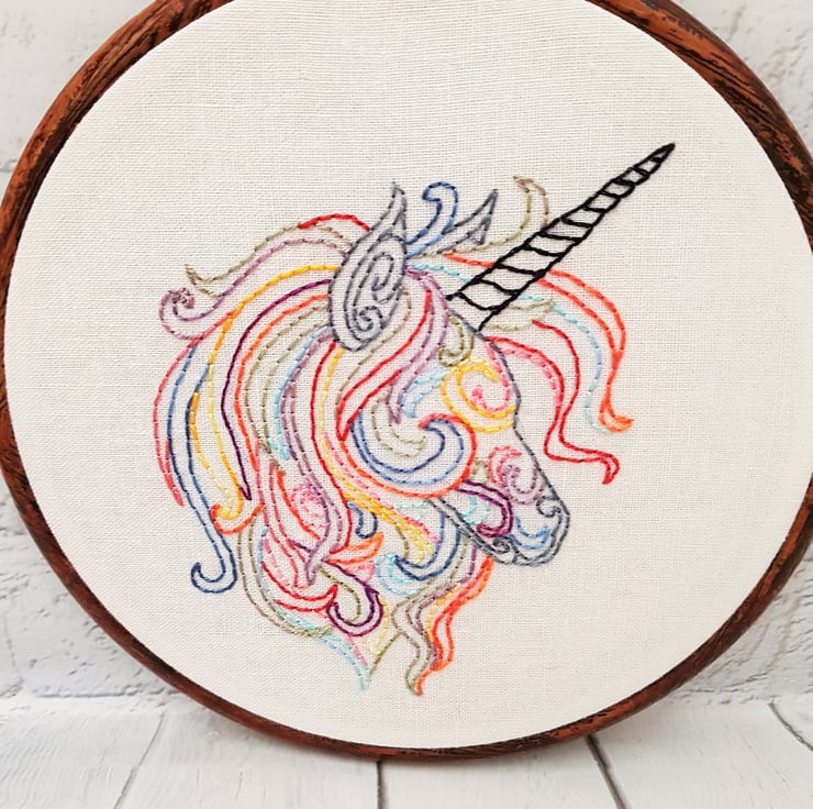 The unicorn is completely hand embroidered on to linen using an assortment of brightly coloured perle threads. It's hard to see on the photos, but the horn is stitched in a black glitter thread to add a little bit of sparkle.