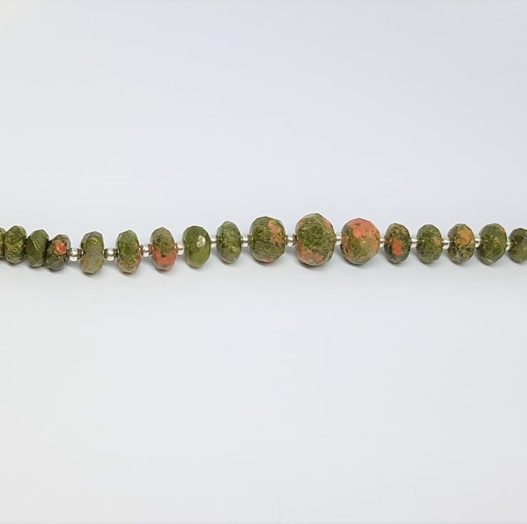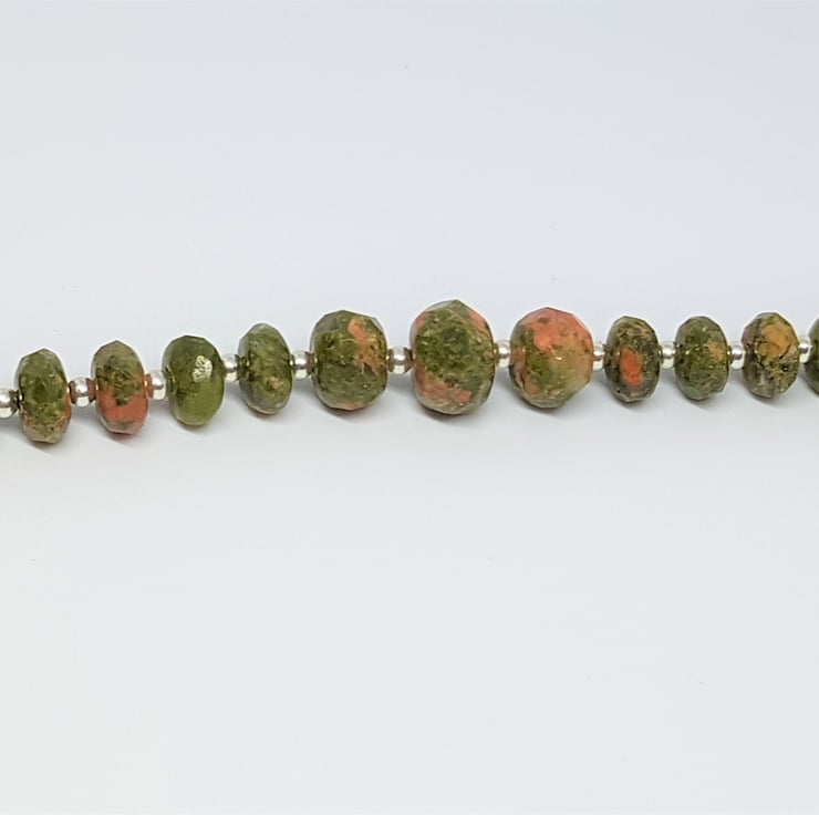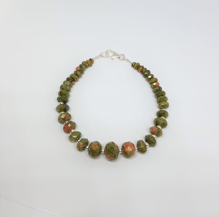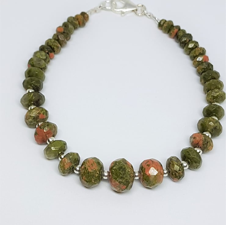 This is a more substantial style of bracelet, which features graduated sizes of faceted Unakite and sterling silver beads which have been threaded on to a sterling silver beading chain.