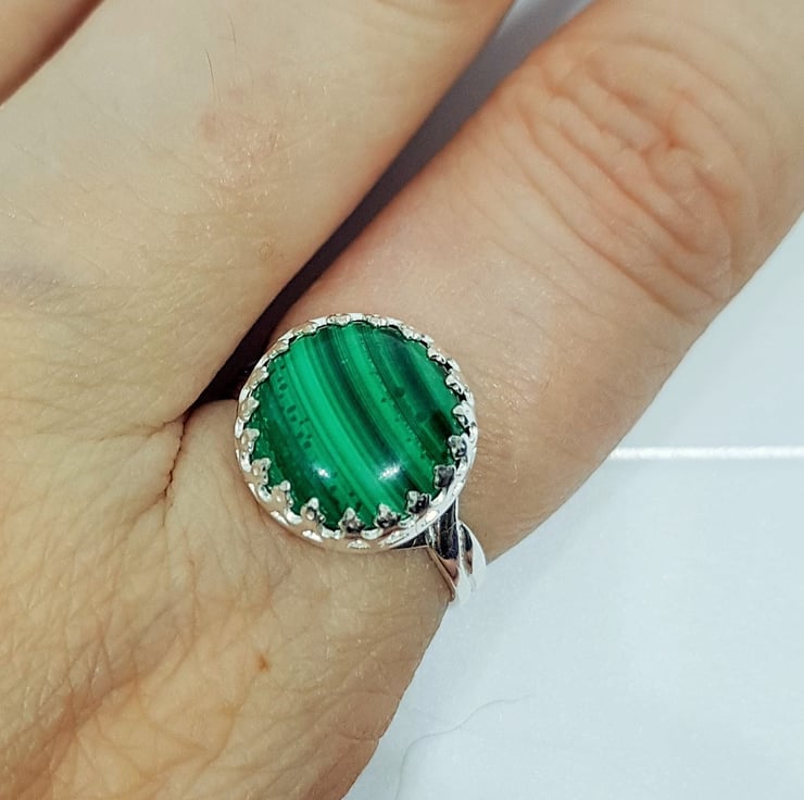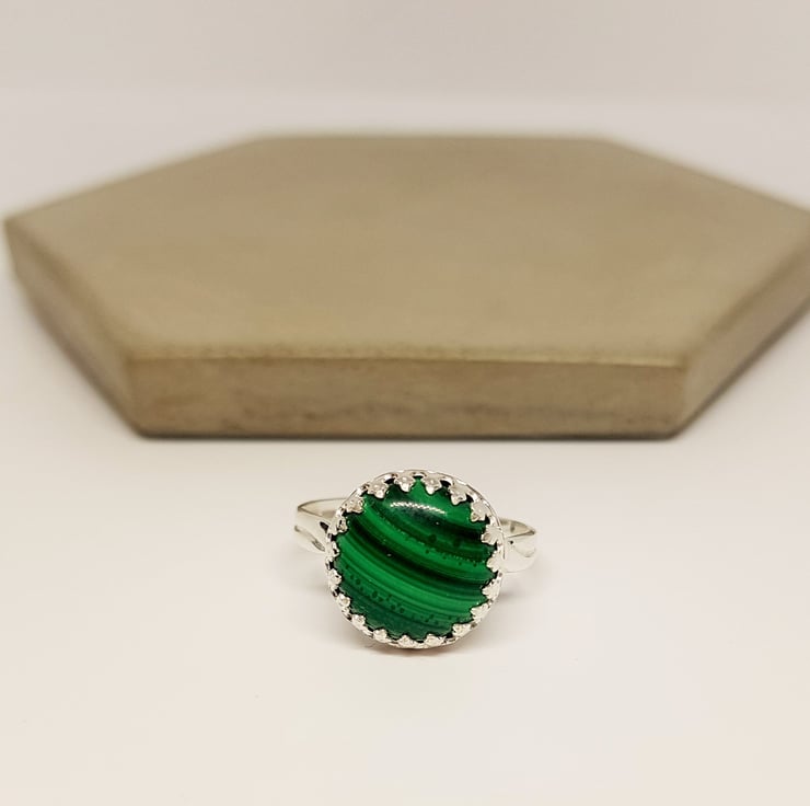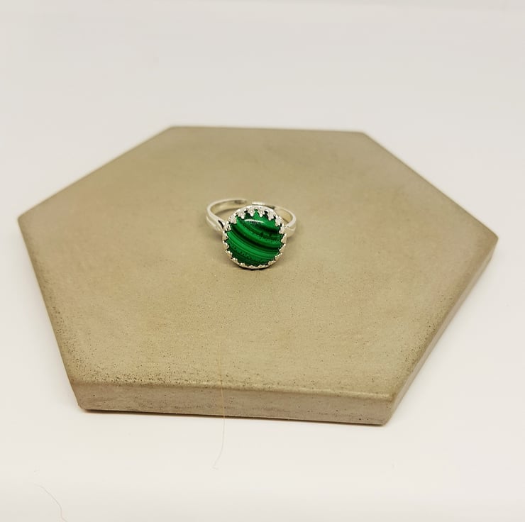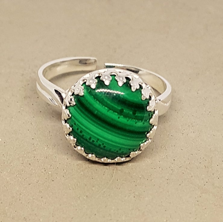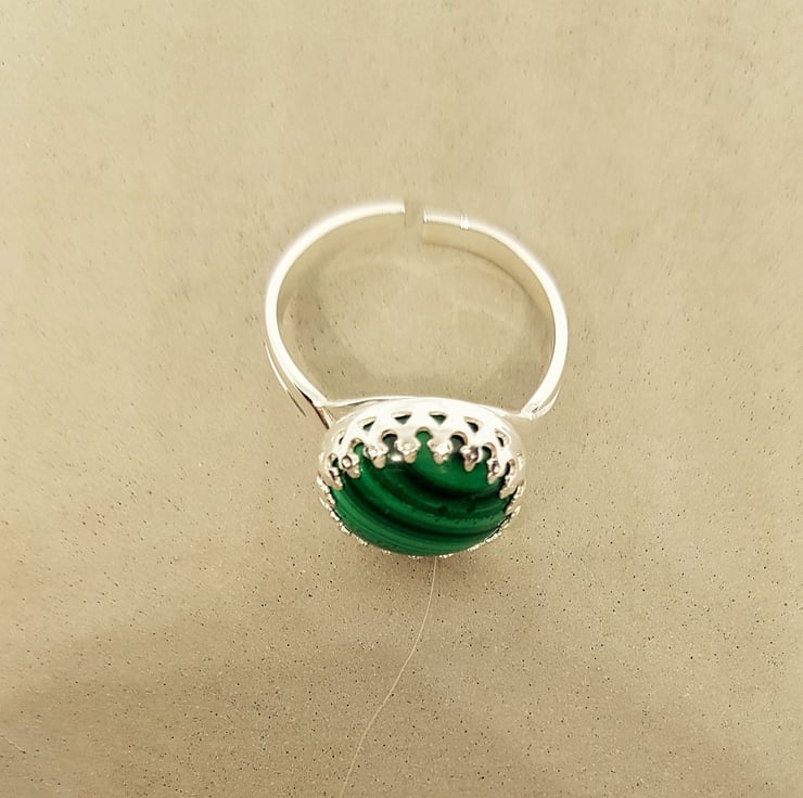 This gorgeous 12mm Malachite cabochon is set into an adjustable ring setting. Malachite is one of my favourite gemstones it is such a striking green shade, with a black striations running through.
