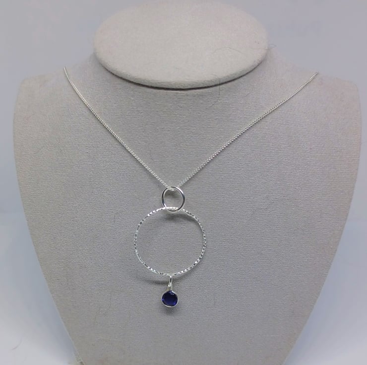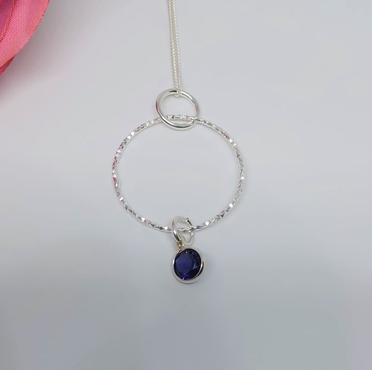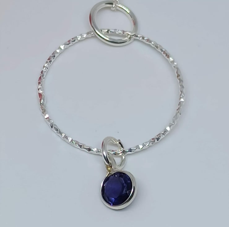 5mm faceted Iolite gemstone drop below a textured sterling silver ring. Silver ring measures approx 20mm.