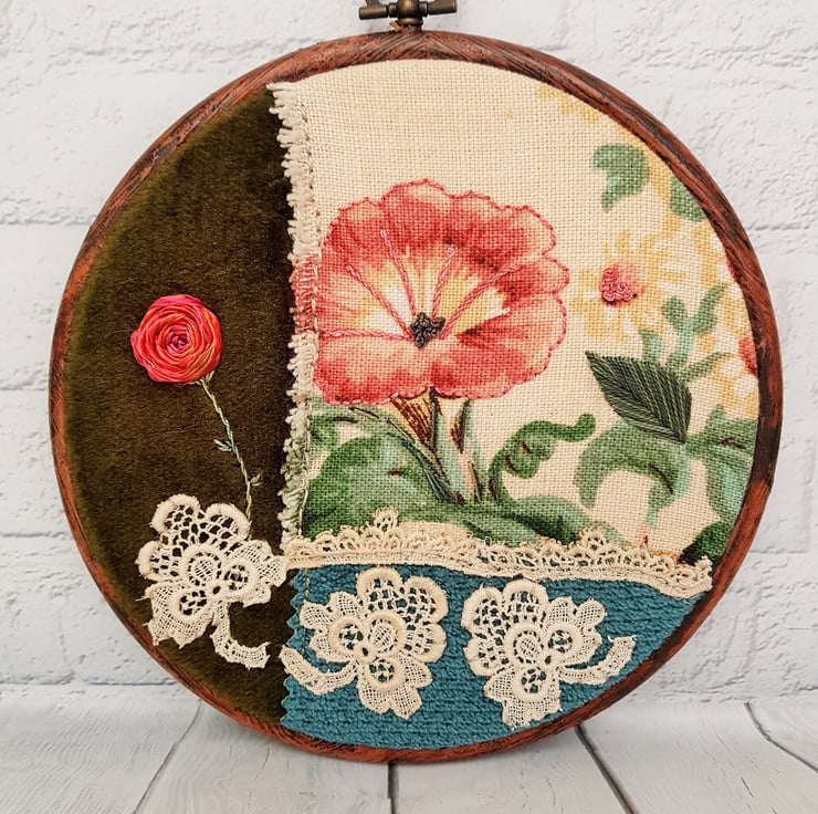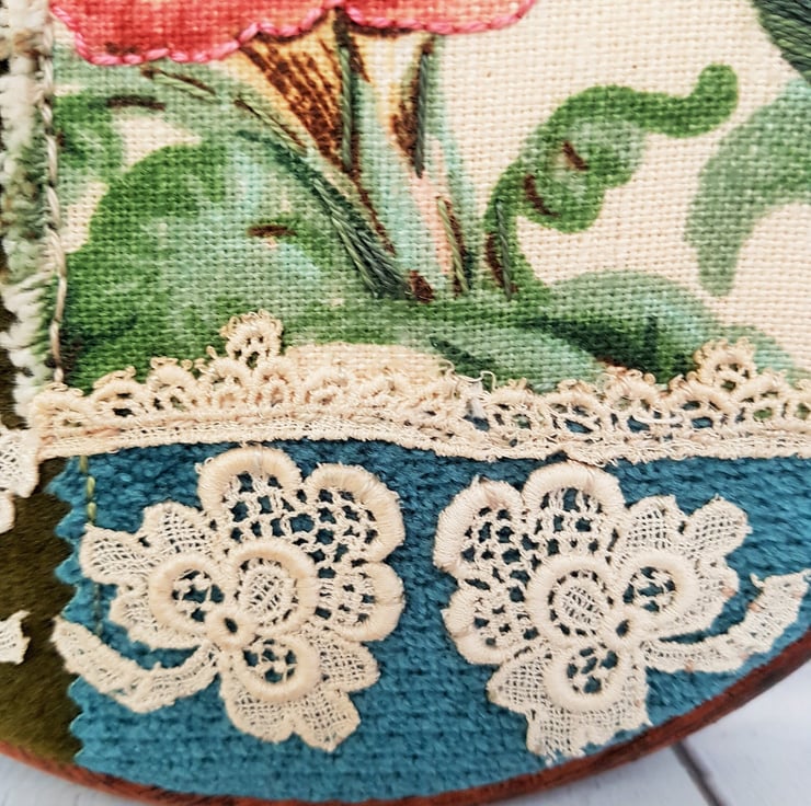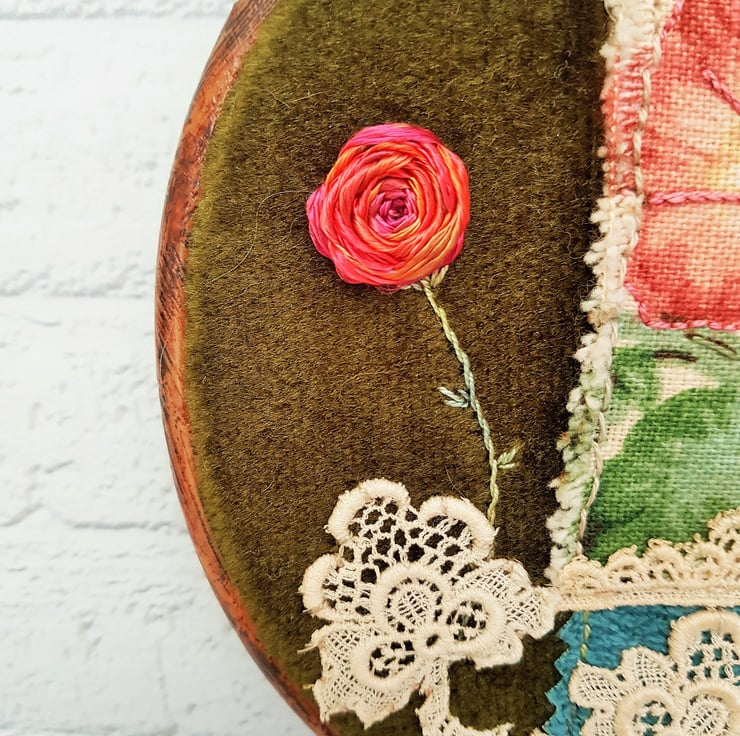 This hoop is a combination of applique work and traditional embroidery, using vintage textiles and trims.